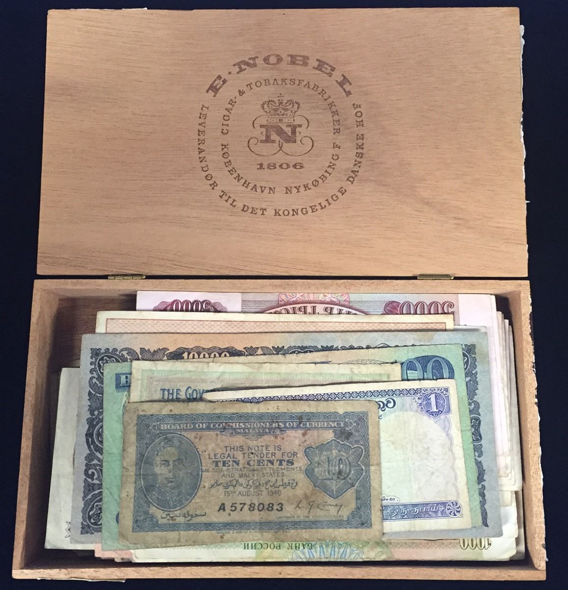 Accumulation of world banknotes housed in old cigar case, early 20th century to 1990s, mixed condition. (100+)