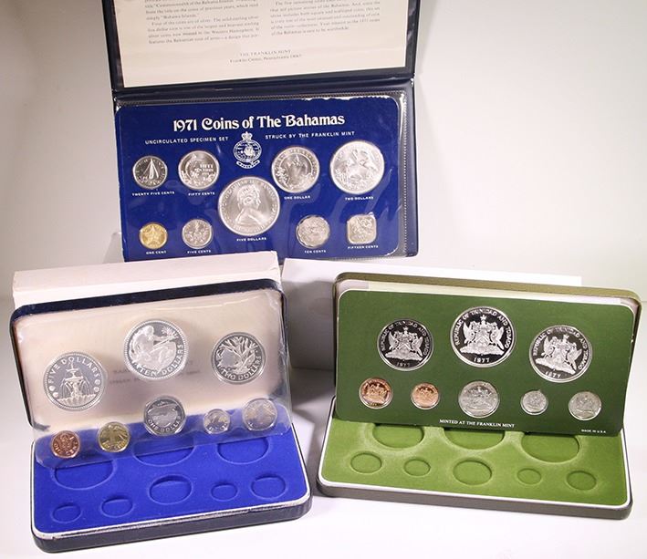 Barbados, proof sets, 1974 (2), containing the silver proof Five & Ten Dollars (KM. 16a (2), 17a (2), total: ASW 3.854); together with Trinidad & Tobago, proof set, 1977, containing the silver proof Five & Ten Dollars (KM. 35a, 36a, total: ASW 1.924); plus Bahamas, uncirculated set, 1971, containing the silver Fifty Cents, One, Two and Five Dollars (KM. 21, 8, 23, 24, total: ASW 2.8721), all in original packaging, the first two sets, the card sleeve stuck to cases, one damaged, coins are still FDC (4 sets, total lot: ASW 8.6501)