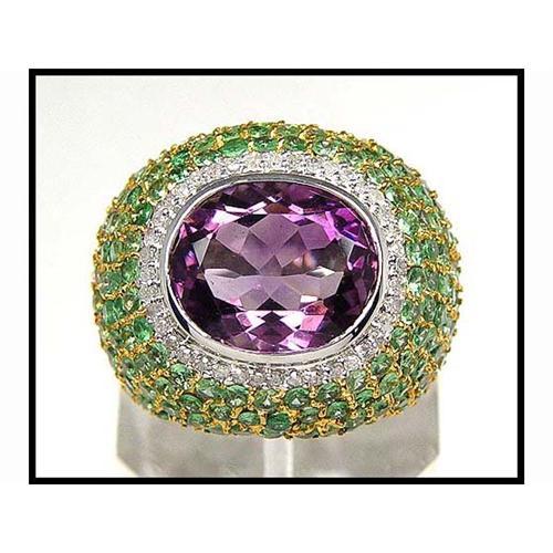 Here is the masterpiece of a gifted designer and goldsmith. She has formed 18K gold (19.1 grams) with great skill to create this magnificent ring. 164 natural green garnets (tzavorites) exhibit collection quality brilliance as set. The center amethyst with diamond border completes the design. Measures 23mm (15/16") long x 27mm (11/16") wide. Was priced for $2500. Size 7 1/2.
