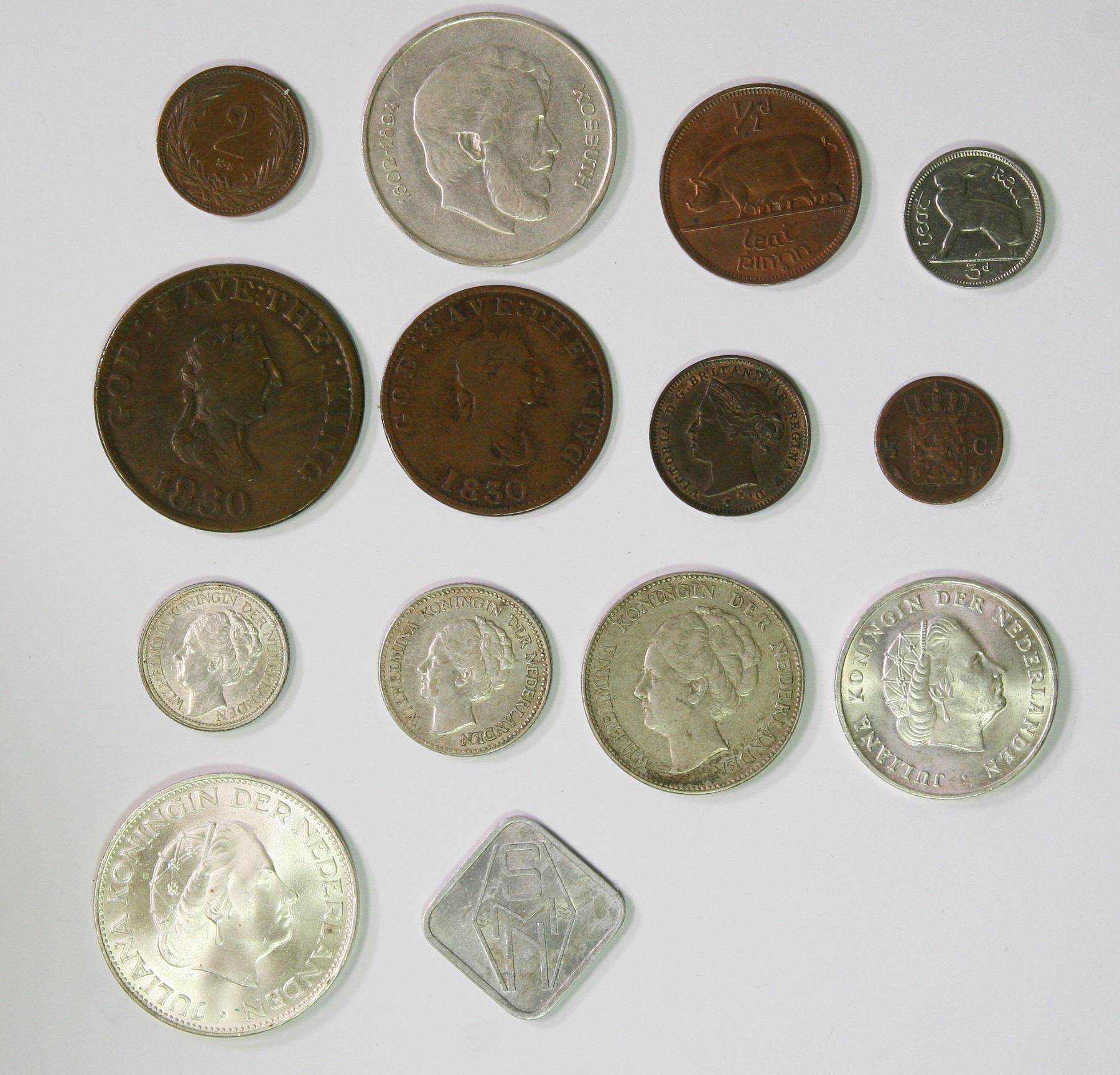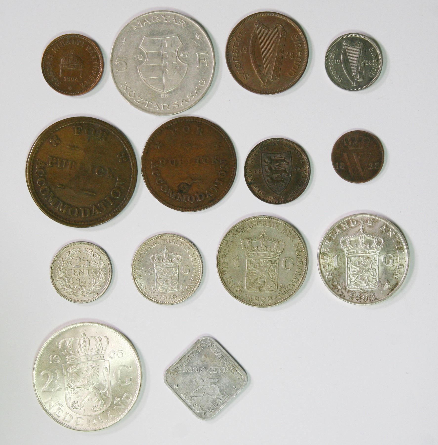 Hungary, Kingdom, Franz Joseph I, Two Filler, 1904; silver Five Forint, 1947, (KM. 481, 534a); Ireland, Republic, Half Penny, 1928, Threepence, 1928 (KM.2, 4); Isle of Man, George III, McTurks Token, Public(K) Accommodation, Half Penny and Penny, 1830; Jersey, Victoria, 1/48 Shilling, 1877 (KM.6); Netherlands, William I, Half Cent, 1823, Wilhelmina I, silver Twenty Five Cents, 1941, silver Half Gulden, 1928, silver Gulden, 1928, 1964, silver Two & Half Gulden, 1966, (KM.51, 614, 160, 161.1, 184, 185); plus Netherlands, Amsterdam, Twenty Five Gulden Ship Token, graded as fine - choice uncirculated, a few scarcer issues (14 coins)