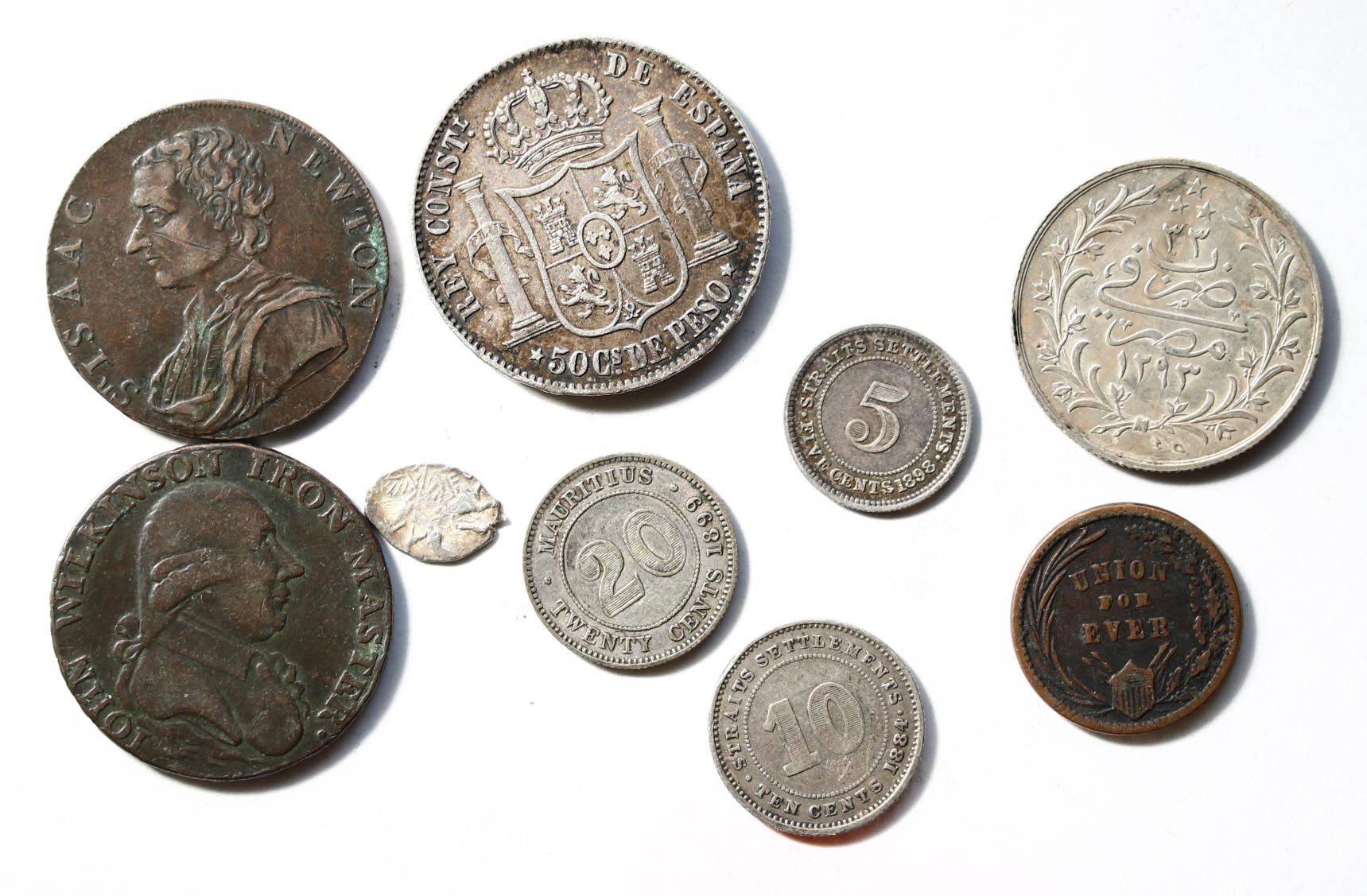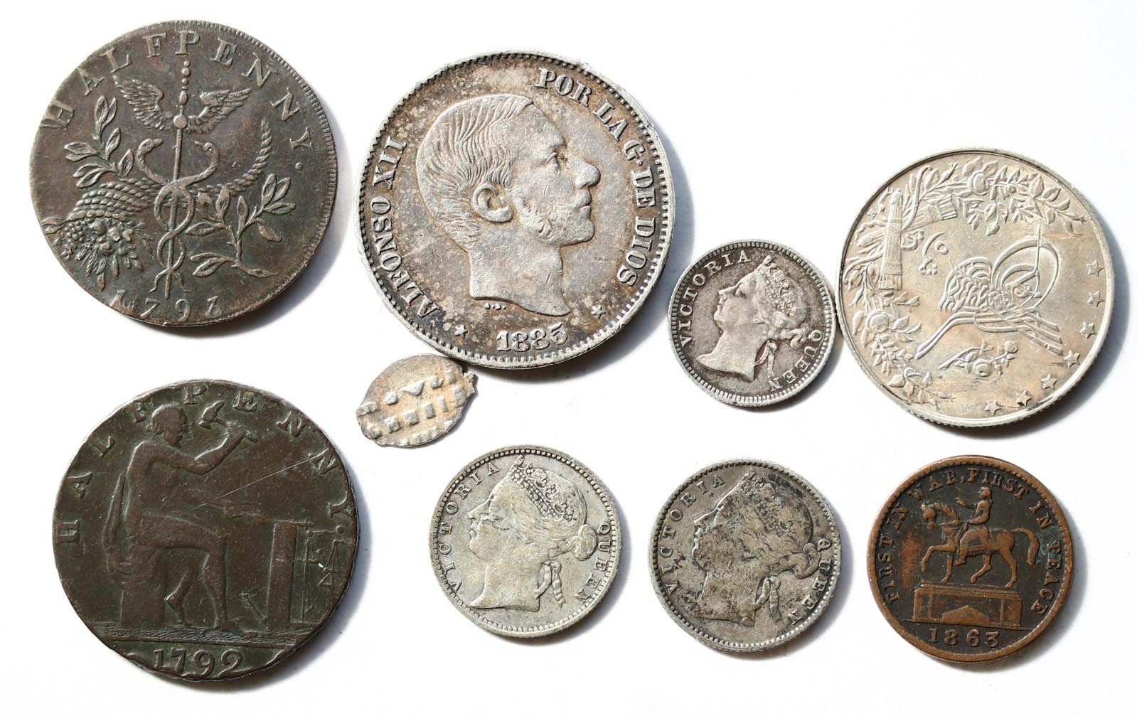 World Coin Lot; Assorted Group; British tokens, US Civil War token, World silver coins. Group of 9
