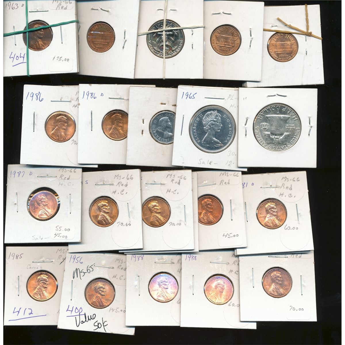 World Coinage Lot; includes A 2” x 2” x 8” box of one hundred and five (105) pieces of U.S. and Canadian coinage, Cents to Dollars. The coins have been graded and priced by the consignor and total many thousands of dollars. The grades and prices on the coins are highly exaggerated and the lot should be carefully viewed.