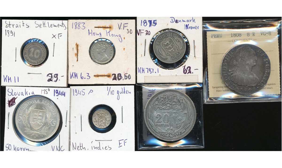 World Coinage Lot; includes Peru 1808 Real ICCS VG8, Denmark 1875 1 kroner, Egypt 1916 20 Piastre, Hong Kong 1883 Ten Cents, Indies 1945P 1/10 Gulden, Slovakia 1944 50 Korun & Straits Settlements 1891 Ten Cents. Nice lot of 7 pcs VG to AU.