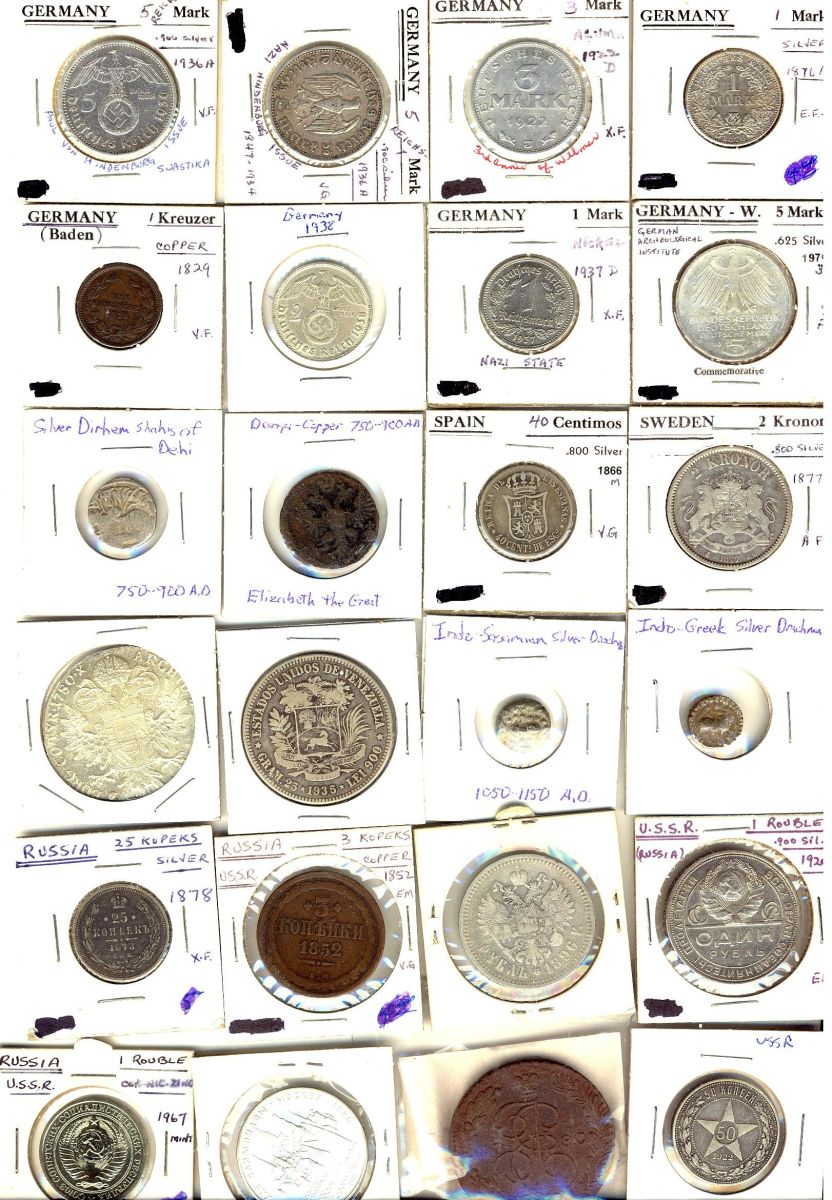 World Coinage. Lot of 41 pcs, mainly from Europe. Includes coins from Austria(2), Mexico(2), Great Britain(4), Venezuela(1), Italy(1), Turkey(1), Belgium(1), Poland(1), Sweden(1), Spain(2), Frnace(10) Germany(11), Russia(9) and Ancients(4). Lot should be viewed, dates vary in late 1800's and early 1900's with lots of silver coins. Should be viewed.