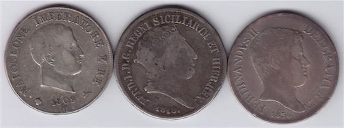 Includes: Napoleon 1809M 5 Lire, KM#10.4, F-VF; Naples 1818 120 Grana, KM#281, F; Naples 1836 120 Grana, KM#325, F-VF. 3 Pcs.