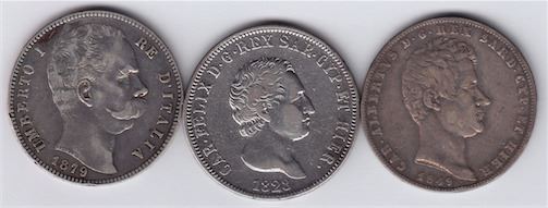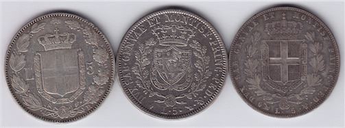Includes: Sardinia, 1828 5 Lire, KM#116.2, F-VF; Sardinia, 1849 5 Lire, KM#130.2, VF; Kingdom of Italy, 1879 5 Lire, KM#20, VF. 3 Pcs.