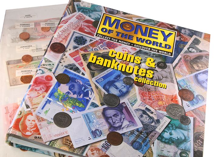 Coins and banknotes from all over the world, housed in a special album, mostly in uncirculated condition, great for the starter. (lot)