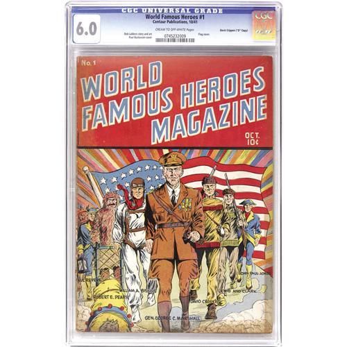 <B>World Famous Heroes Magazine #1 Davis Crippen ("D" Copy) pedigree (Centaur, 1941) CGC FN 6.0 Cream to off-white pages.</B></I> A flag cover featuring American heroes is the kind of thing we like to see! Paul Gustavson handled the cover art, and Sam Glanzman is among the interior contributors. This came out near the end of Centaur's publishing tenure, and like just about any Centaur comic, it's not easy to find. Overstreet 2006 FN 6.0 value = $357. CGC census 6/06: 1 in 6.0, 6 higher. <I>From the Crippen Collection.</B></I> <BR><BR><B>Important notice:</B> Heritage usually auctions material at the rate of 200-250 lots per hour. On some occasions eBay Live bid software or the Internet may not be able to keep up with the pace of the auction. We recommend placing a realistic absentee bid now as insurance to avoid disappointment. Occasionally the auctioneer may eliminate or reject an eBay Live bid, and the auctioneer may also reopen a lot after the close of the eBay live bidding (usually because we missed an audience bid), and may reject your bid even if it shows you as the winning bidder. By bidding via eBay Live, you agree that Heritage may award the lot to another bidder at its sole discretion under the circumstances described above or any other reasonable circumstances. Since eBay bids are not shown to us until we open the lot on the floor, we treat those bids just like floor bids. In most cases the floor responds before the eBay bid is presented to us, due to Internet lag time, so for consistency we have made it a policy that floor bids are always considered first over tie eBay live bids. Also please note that all Heritage lots purchased through eBay Live carry a 22.5% Buyer's Premium. Please make sure you read the Terms and Conditions before you bid. This lot is being auctioned in conjunction with a live floor auction by Heritage Auction Galleries. All final auction and invoice information will be supplied by Heritage Auction Galleries, and all other information should be considered preliminary. Lot:41001 <BR><BR><B>Winning Notification and Billing:</B> After the FINAL session in this auction is complete, Heritage will send e-mail and snail mail invoices. This process normally takes several days. All final auction and invoice information will be supplied by Heritage Auction Galleries, and all other information should be considered preliminary. <BR><BR>This auction will be conducted on a live auction floor and over the Internet through eBay Live. If you choose to place an absentee bid, please take a moment to <font color='#0000ff'><u><a href='http://pages.ebay.com/liveauctions/help/before/laabsentee.html'>learn how eBay Live absentee bidding works</a></u></font><font color='#000000'>