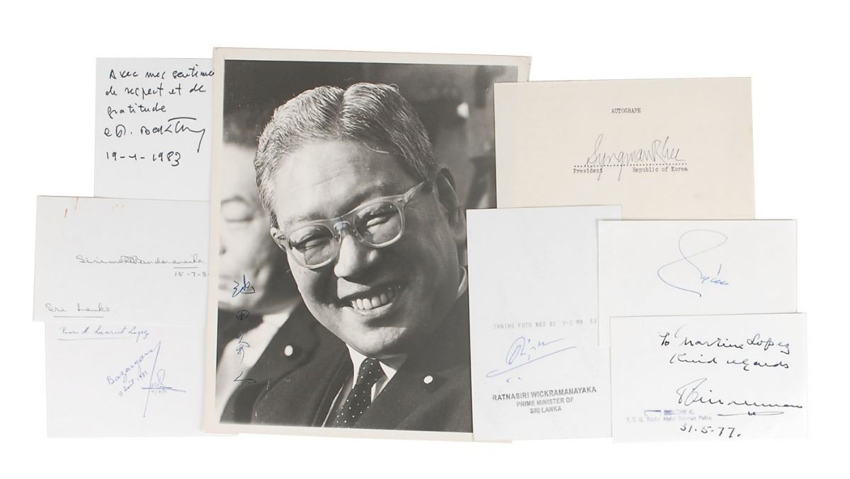 Collection of eight items signed by prime ministers and presidents from around the world, including: Shapour Bakhtiar (Iran); Sirimavo Bandaranaike (Sri Lanka); Mehdi Bazargan (Iran); Hayato Ikeda (Japan); Mustafa Khalil (Egypt); Tunku Abdul Rahman (Malaysia); Syngman Rhee (South Korea); and Ratnasiri Wickremanayake (Sri Lanka). In overall fine condition. Accompanied by a transmittal letter from the prime minister’s officer for the Ikeda signed photo.