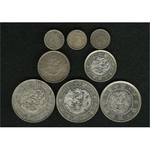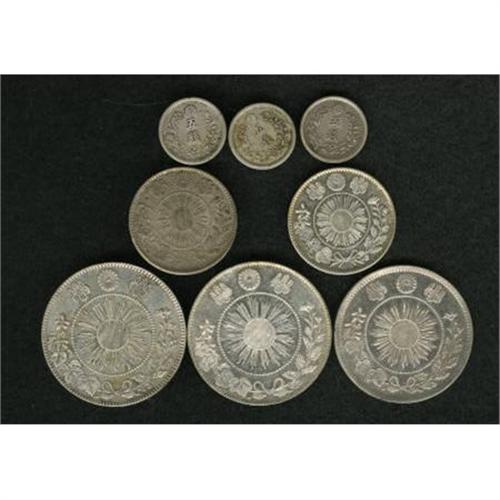 <B>19th Century Japanese Silver Selection,</B></I> 5 Sen Year 6 VF and 10 (2), VF and toned XF, 20 Sen Year 3 (2), both XF, 50 Sen Year 3 nice VF-XF and Year 4 (2), VF-XF and XF. A nice little group of these popular coins. <B>Sold as is, no return lot.</B></I><BR><BR><b>Shipping:</b> Coins & Currency (<a target="_blank" href="http://www.heritageauctions.com/common/shipping.php">view shipping information</a>)