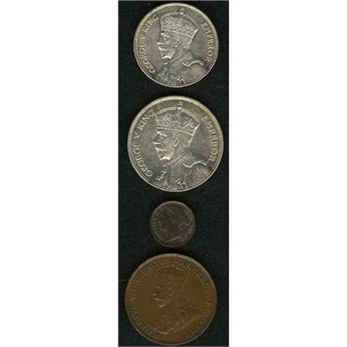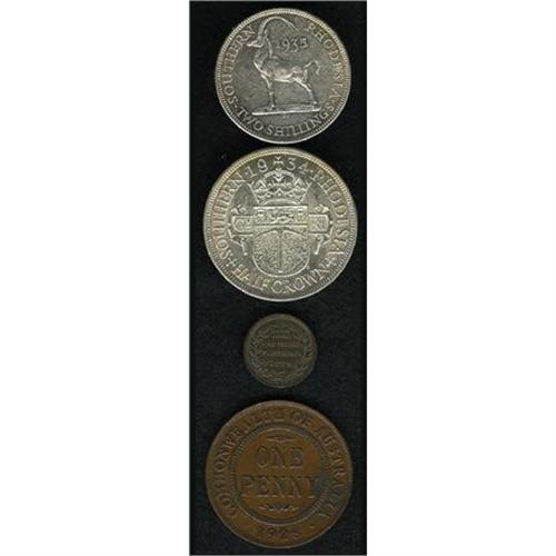 <B>Better British Commonwealth Quartet,</B></I> Australia Penny 1928, brown XF, strong central diamond, Great Britain (used in Malta) 1/3 Farthing 1878, brown XF, Southern Rhodesia 2 Shillings 1935, lustrous XF, tiny rim nick and Halfcrown 1934, fully lustrous AU, very attractive. <B>Sold as is, no return lot.</B></I><BR><BR><b>Shipping:</b> Coins & Currency (<a target="_blank" href="http://www.heritageauctions.com/common/shipping.php">view shipping information</a>)
