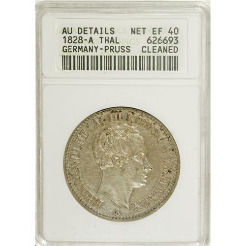 <B>Crowned gold and silver:</B></I> (1) Poland gold 20 Zlotych 1925, MS63 ANACS; (2) Germany 5 Mark 1927-D Hindenburg (KM-M1), net PR60 cleaned ANACS but it's not cleaned, it's just been subjected to the usual Euro handling in trays, is brilliant and attractive; (3) Germany-Prussia Thaler 1828-A, net EF40 cleaned ANACS, but looks like a normal circ piece to this cataloguer.<BR><BR><b>Shipping:</b> Coins & Currency (<a target="_blank" href="http://www.heritageauctions.com/common/shipping.php">view shipping information</a>)