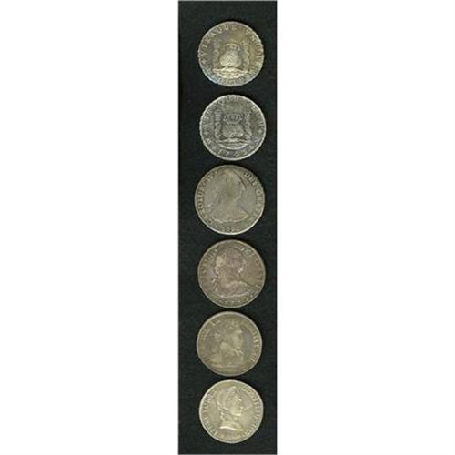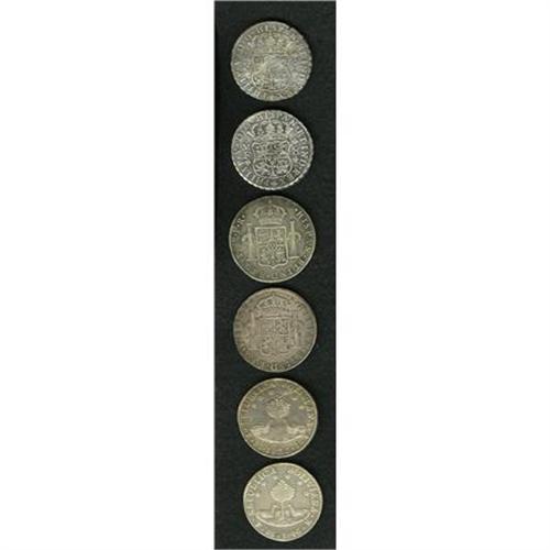 <B>Interesting Group of Latin Overdates,</B></I> Bolivia 8 Reales 1781/0, very faint, nice toned VF, the Calbeto plate coin, and 1790/89 toned AVF, 8 Soles 1830/29 VF+ and 1846/5 cleaned VF, and Mexico Pillar 8 Reales, both sea salvaged but quite nice, 1739/8/6 and 1743/2. <B>Sold as is, no return lot.</B></I><BR><BR><b>Shipping:</b> Coins & Currency (<a target="_blank" href="http://www.heritageauctions.com/common/shipping.php">view shipping information</a>)