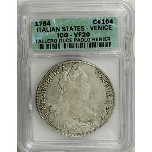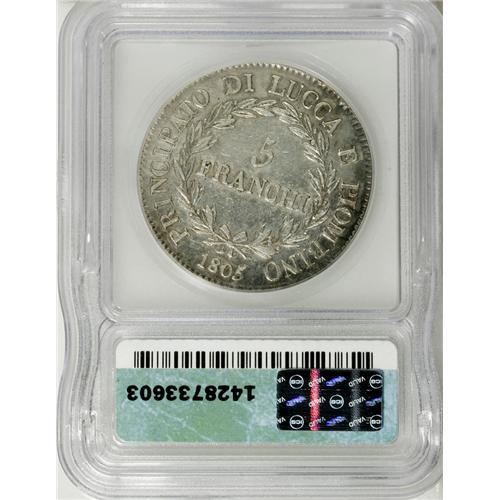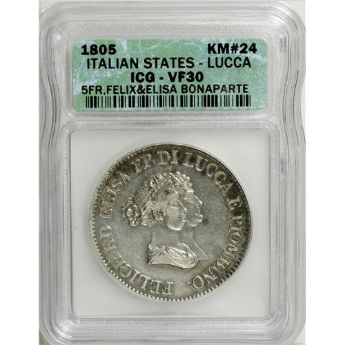 <B>Italian States duo:</B></I> (1) Lucca 5 Franchi 1805, KM-24, VF30 ICG, together with (2) Venice Tallero 1784, C-104, VF20 ICG. A decent if well circulated pair.<BR><BR><b>Shipping:</b> Coins & Currency (<a target="_blank" href="http://www.heritageauctions.com/common/shipping.php">view shipping information</a>)