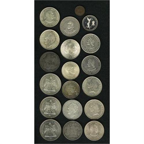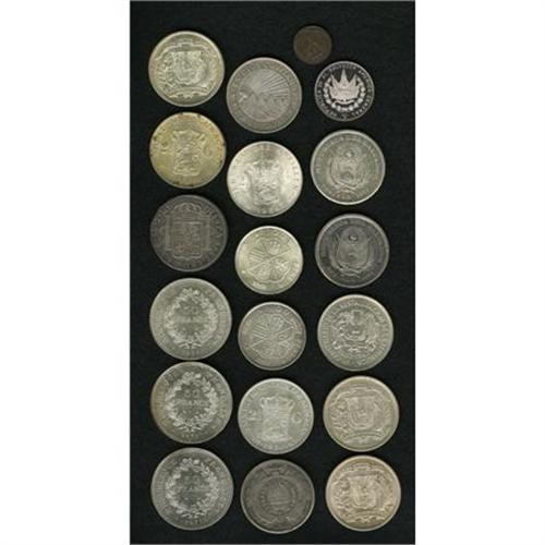 <B>Primarily Silver Assortment,</B></I> Curacao 2 1/2 Gulden 1944 AU, Dominican Republic Peso 1955 (2) BU, 1952 XF and 1963 BU, El Salvador Peso (2), 1893 XF and 1911 VF, 5 Colones 1971 Proof, France 50 Francs (3), 1975, 1977 and 1978 choice BU, Honduras bronze Peso 1862-TA, choice UNC, reflective surfaces and razor sharp edges, possibly a Proof, and silver Peso 1886 VF, Mexico 8 Reales 1787Mo-FM, toned VF, Netherlands 2 1/2 Gulden 1930 cleaned VF, Netherlands Antilles 2 1/2 Gulden 1964 BU, Nicaragua Cordoba 1912H, cleaned VF-XF, scratch in the obverse field, and Spain 100 Pesetas (2), 1966 XF and 1966 BU. <B>Sold as is, no return lot.</B></I><BR><BR><b>Shipping:</b> Coins & Currency (<a target="_blank" href="http://www.heritageauctions.com/common/shipping.php">view shipping information</a>)