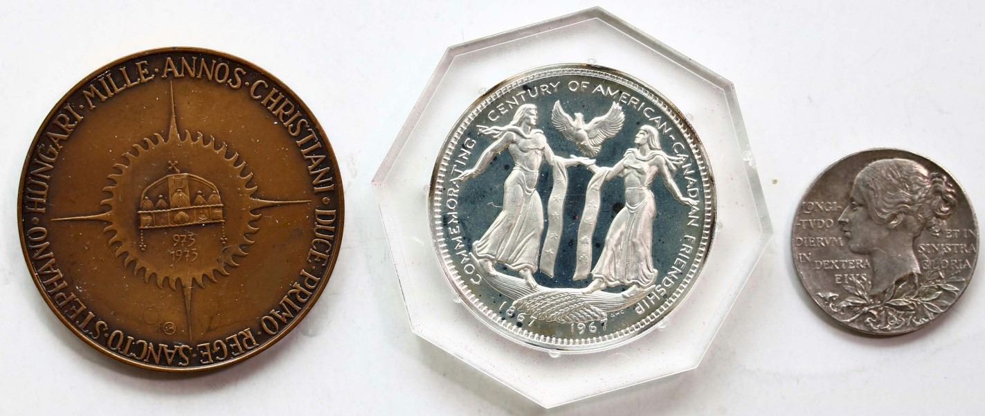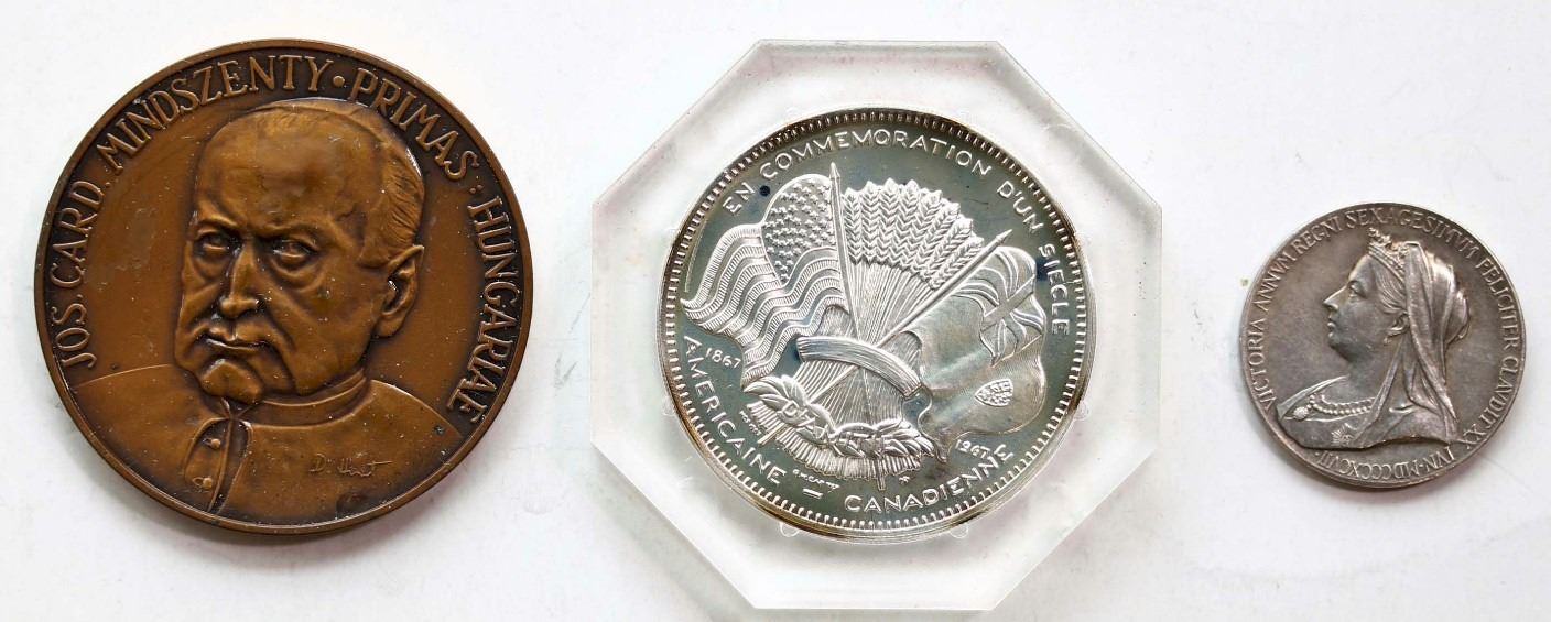 World Medals; includes Great Britain 1837-1897 Victoria (sml) medal, US-Canadian Friendship Coin-Medal, Hungary - Jos. Card Mindszenty Primas Medallion. Lot of 3 different medals/medallions.