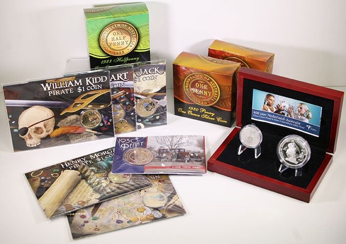 Tuvalu, One Dollar Silver Proof Coin, 1930 Penny 75th Anniversary, 2005 (2); 1923 Half Penny, 2006; Uncirculated One Dollar, Young Collectors Pirate Series, 2010-11 (5); Duyfken, Silver Proof Five Dollars, 400 Years the Netherlands-Australia, 2006; Niue, Uncirculated One Dollar Coin, 1930 Penny tribute, 2015