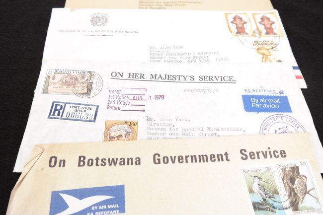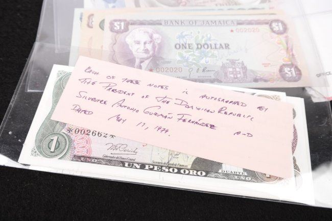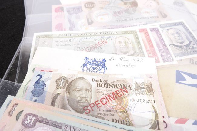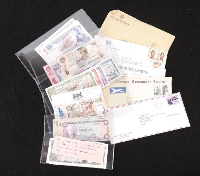 Specimen note sets from the Alan York Estate obtained directly from foreign governments. Usually matched number modern sets, some signed by government officials. Includes Botswana, Jamaica, Dominican Republic, Tonga, Malta, and Mauritius. Mostly obtained in the 1970's, some with transmittal envelopes. Total of six sets, 26 Specimen notes. Some handling, but generally all uncirculated.