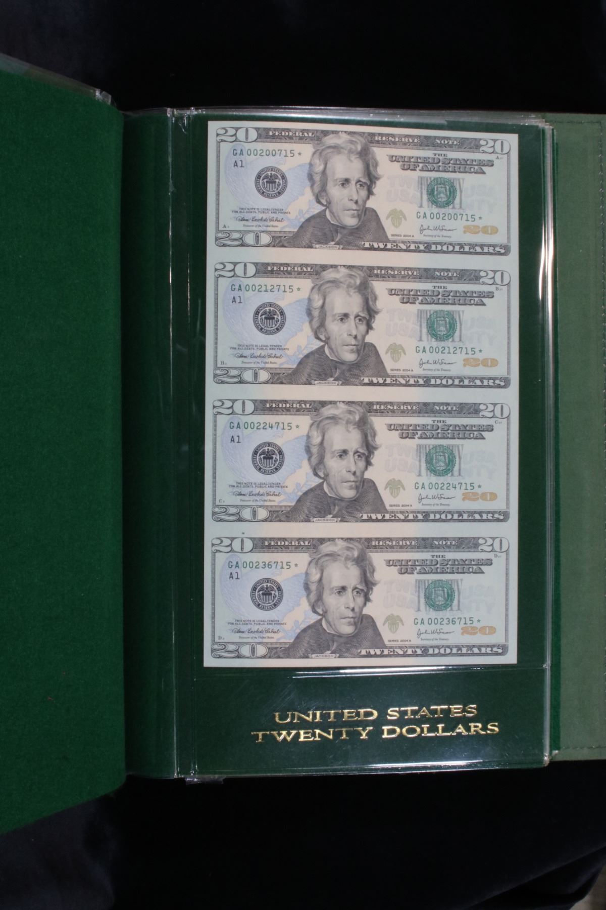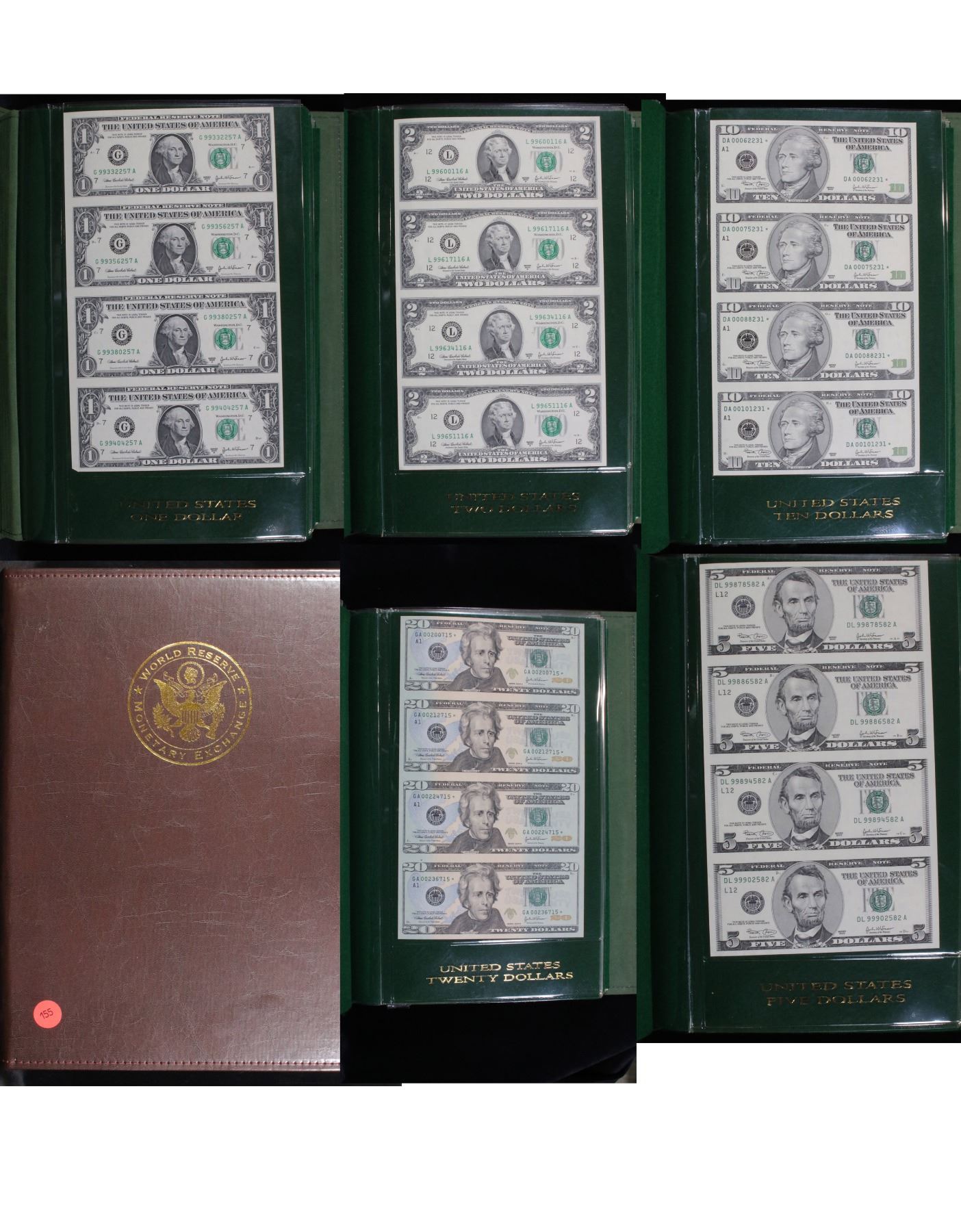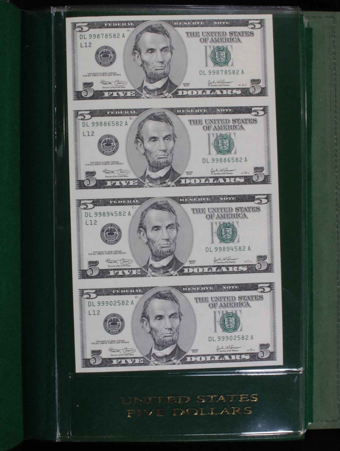 World Reserve Monetary Exchange book, 5 uncut sheets diff denominations. This is a book issued by the World Reserve Monetary Exchange and includes a 4 note uncut sheet of Series 2003A $1, Series 2003A $2, Series 2003 $5, Series 2003 $10, Series 2004A $20. The book is in perfect condition and has blank pages to add additional denominations.