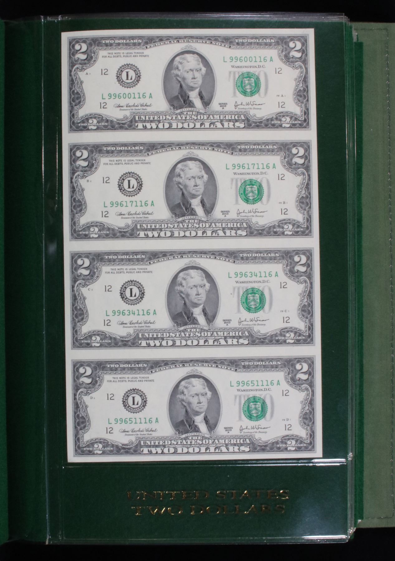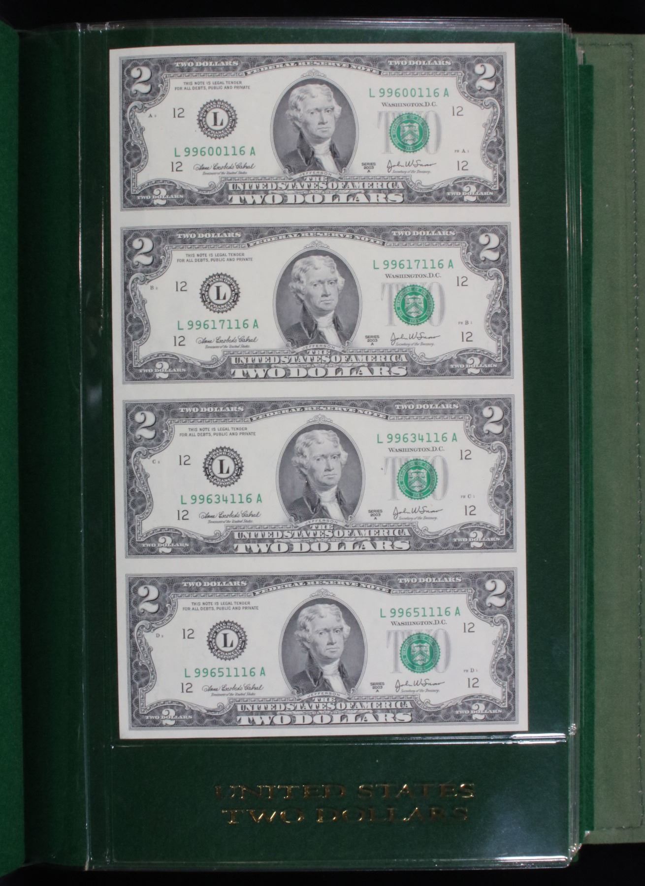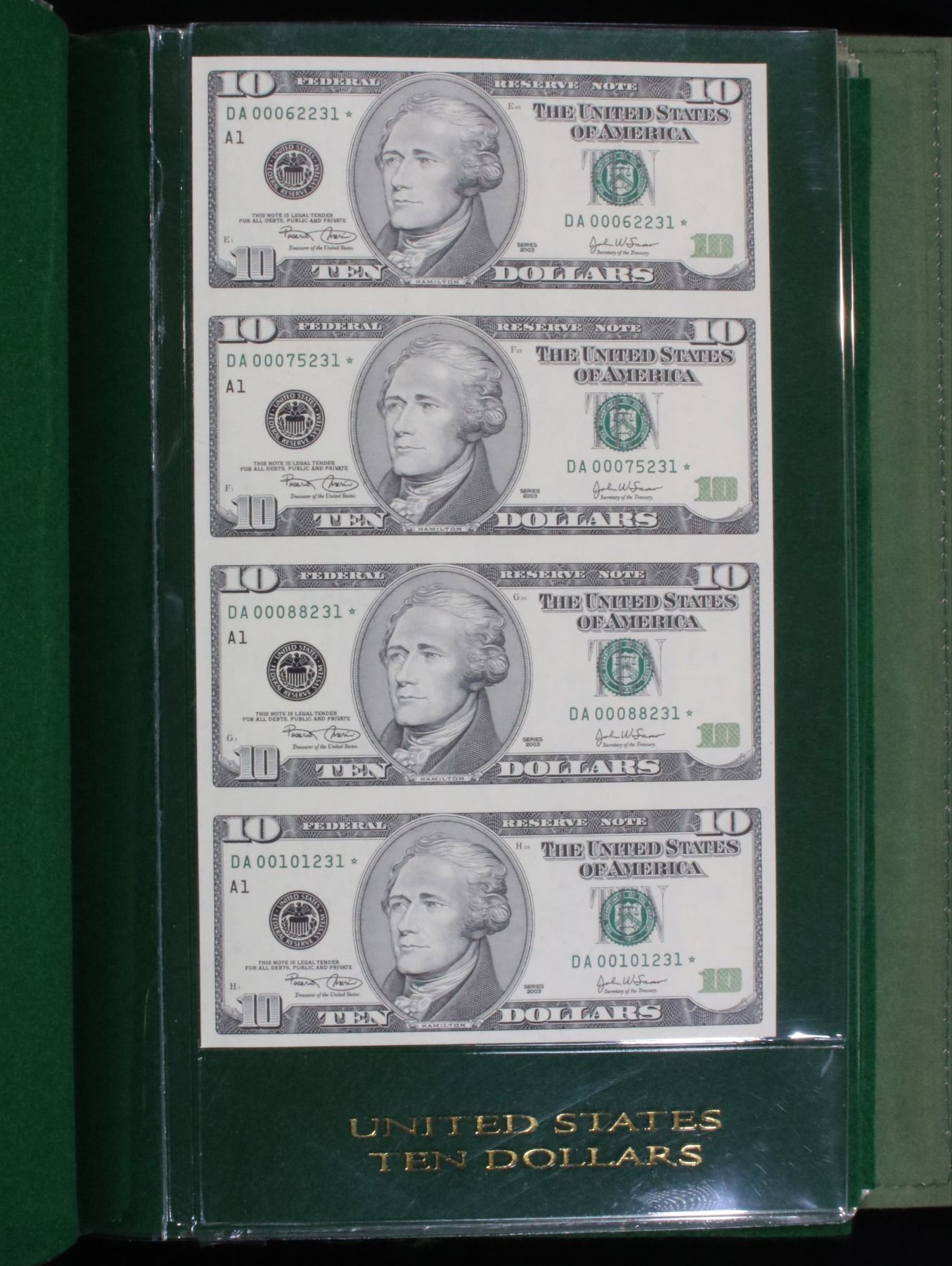 World Reserve Monetary Exchange book, 5 uncut sheets diff denominations. This is a book issued by the World Reserve Monetary Exchange and includes a 4 note uncut sheet of Series 2003A $1, Series 2003A $2, Series 2003 $5, Series 2003 $10, Series 2004A $20. The book is in perfect condition and has blank pages to add additional denominations.