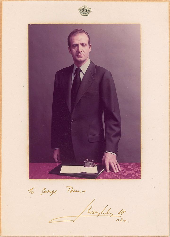 King of Spain (born 1938) who ascended the throne in 1975, two days after the death of Francisco Franco, and oversaw the troubled nation's transition to a constitutional monarchy. Color semi-glossy 5 x 7 three-quarter-length portrait by A. Schomer, affixed to the original 7.75 x 10.5 mount with embossed royal crown, signed and inscribed on the mount in black ink, "To George Barrie, Juan Carlos R 1980." Lower right corner of photo bears the photographer's blindstamp. In fine condition, with light toning to edges of mount. Consignor notes that the recipient of this photo was the Oscar-nominated producer and songwriter George Barrie, who was also the longtime CEO of Faberge.