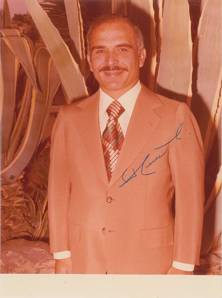 King of Jordan (born 1935) who reigned from 1952 until his death in 1999, remembered for his efforts as a peacemaker in the Middle East. Color satin-finish 7 x 9.5 photo of King Hussein in a handsome half-length pose, signed in black ink. In fine condition. Accompanied by a transmittal from the king's personal aide de camp, dated February 21, 1976.