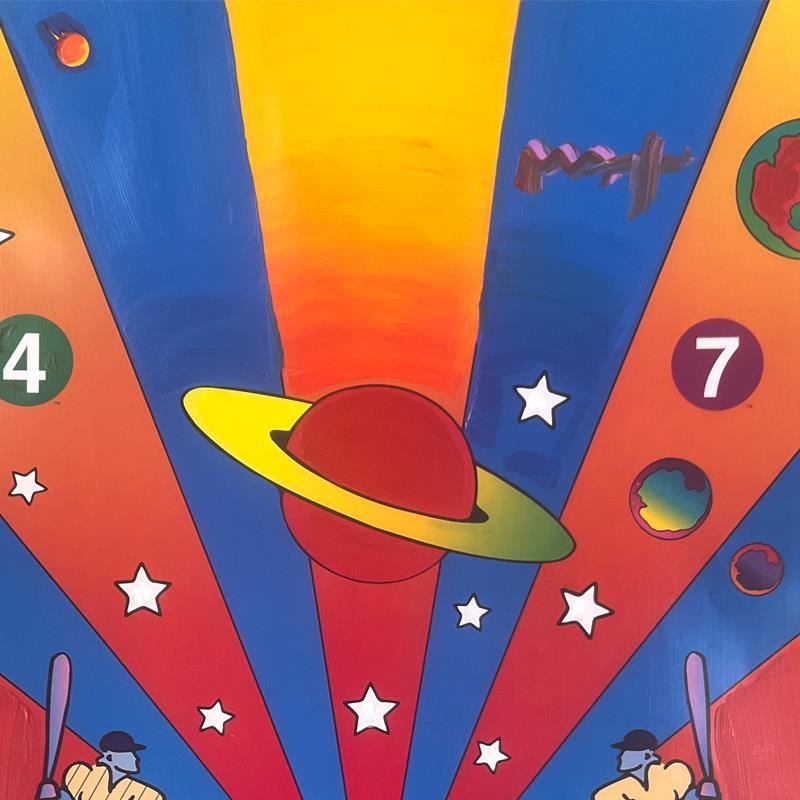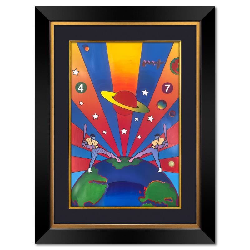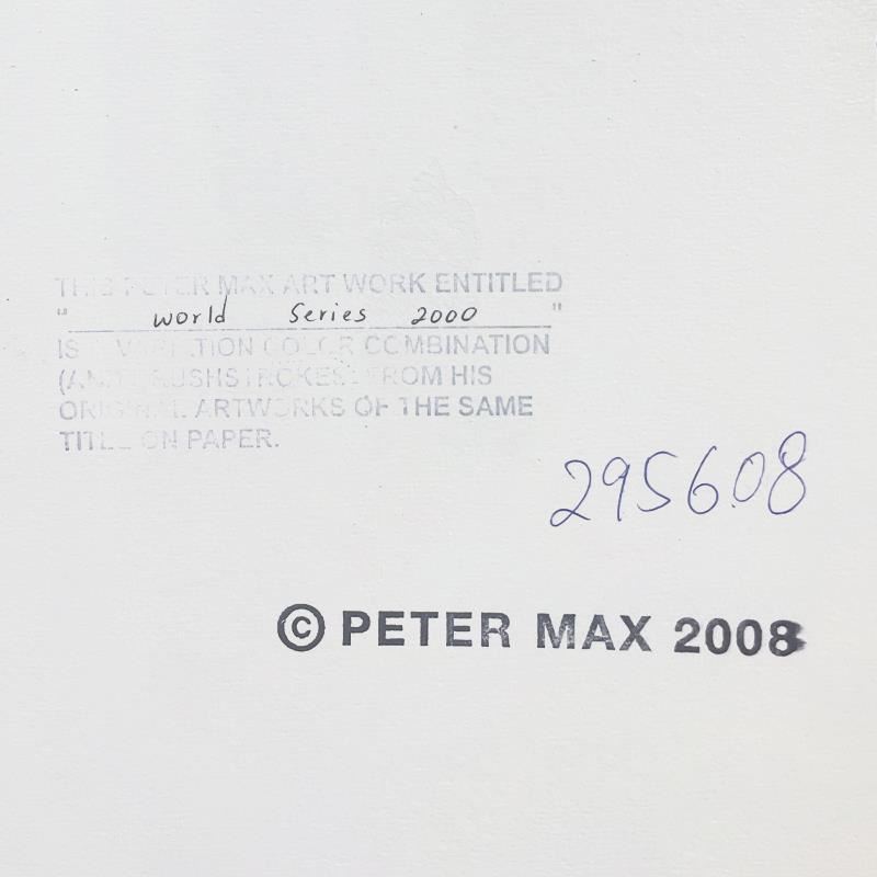 World Series 2000 is a one-of-a-kind acrylic mixed media on paper, hand signed by Peter Max. On the reverse side of this piece there is a registration number from Peter Max Studios certifying authenticity. This piece comes custom framed. Measures approx. 48.5 x 36.5 (frame), 36 x 24 (image).