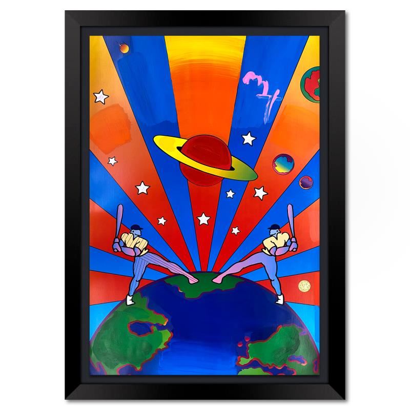 "World Series 2000" is a one-of-a-kind mixed media on paper, hand signed by Peter Max. The piece comes custom framed with a backside cutout to display Peter Max Studio registration number 297207 certifying authenticity. Measures approximately 42" x 30" (frame), 36" x 24" (image). This item requires special handling and may have a longer than usual turnaround.