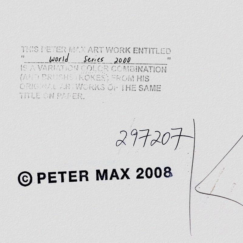 "World Series 2000" is a one-of-a-kind mixed media on paper, hand signed by Peter Max. The piece comes custom framed with a backside cutout to display Peter Max Studio registration number 297207 certifying authenticity. Measures approximately 42" x 30" (frame), 36" x 24" (image). This item requires special handling and may have a longer than usual turnaround.