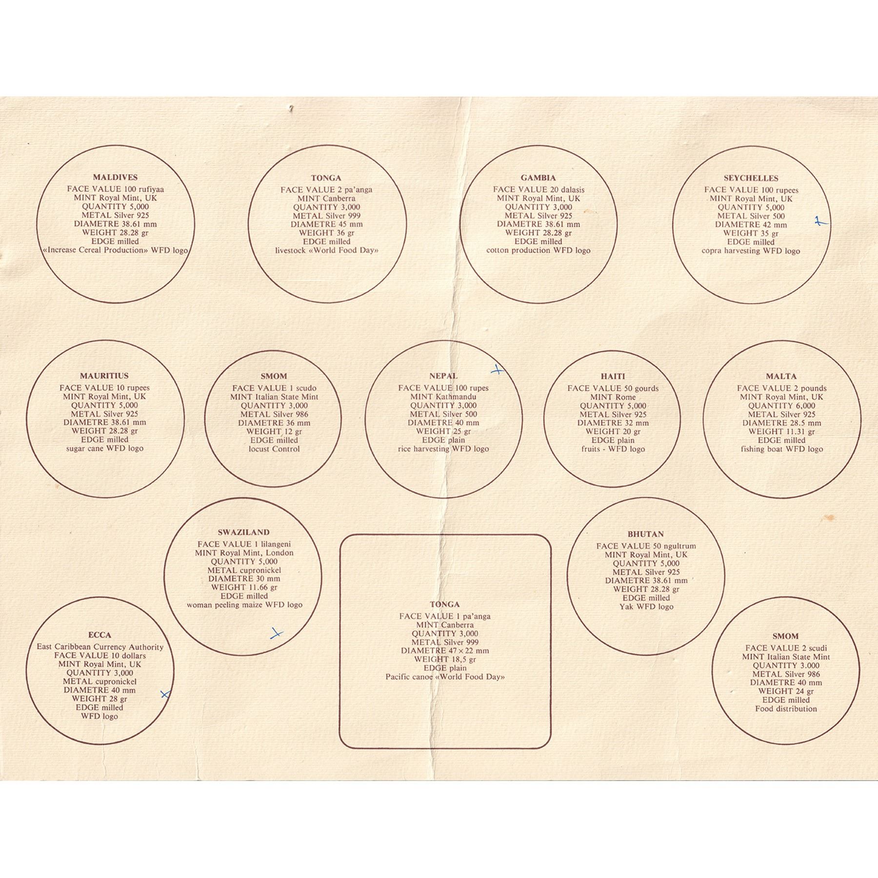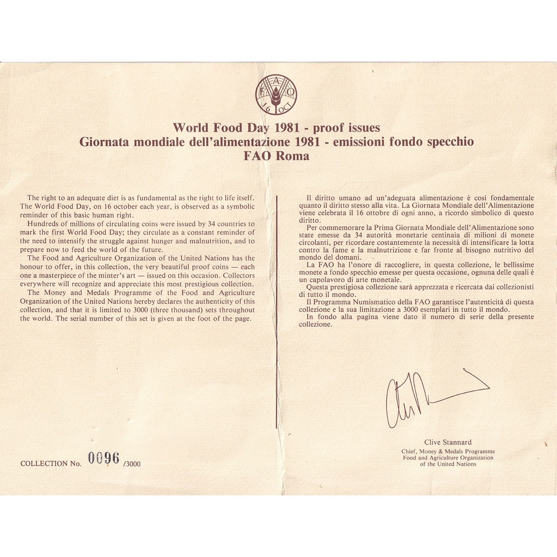 INCLUDES: 14 coins from 12 different countries. 12 coins are varying fineness of silver totalling 8.512ozt pure and 2 contain cupronickel. Please see image of COA for full list of included coins. This set from The Food and Agriculture Organization of the United Nations is #0096 of only 3000 sets worldwide. Coins have some toning. Case shows aging and capsules may be scuffed.
