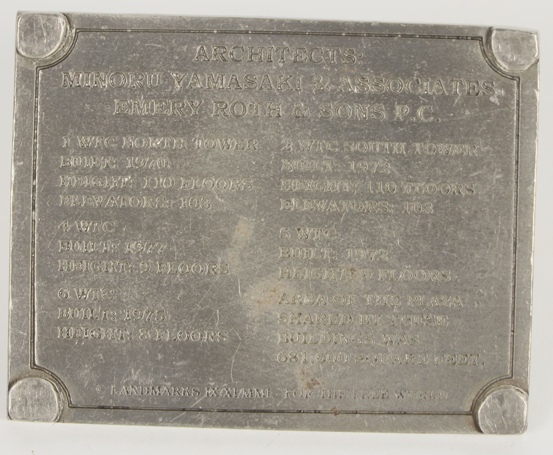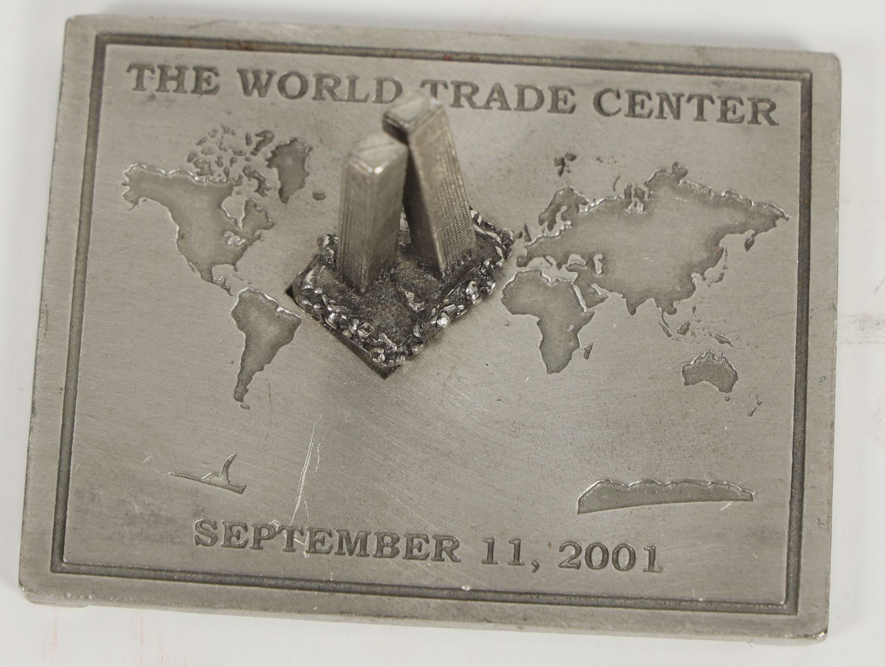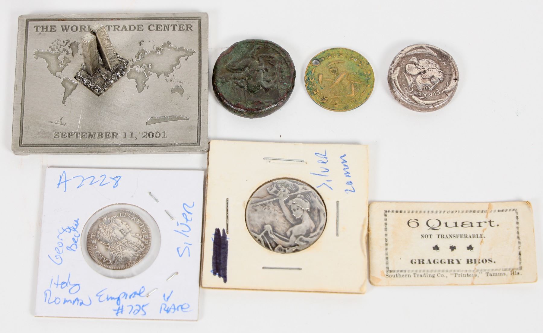 Miscellaneous group: World Trade Center metal square (2 1/2 x 2 inches) with three dimensional twin towers (one inch tall); holed Holy Roman Empire silver coin; Hieron II c275-215 BC Sicily Syracuse ancient AE 27 (16.7 grams); 1905 Societa Larola silver medal; ancient silver piece with horse/head; bridge construction medal, 23 mm; Graggry Bros. 5 quart paper token.
