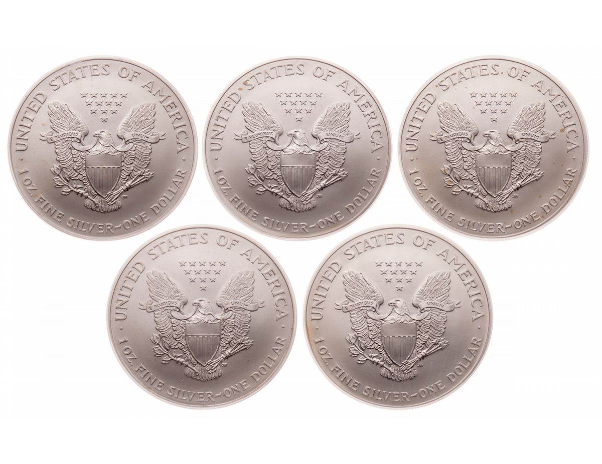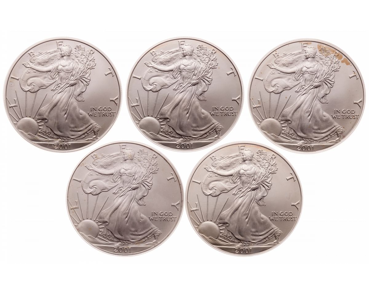 United States. Lot of five (5) 2001 Silver Eagles, World Trade Center - Ground Zero Recovery, PCGS Graded Gem Uncirculated.