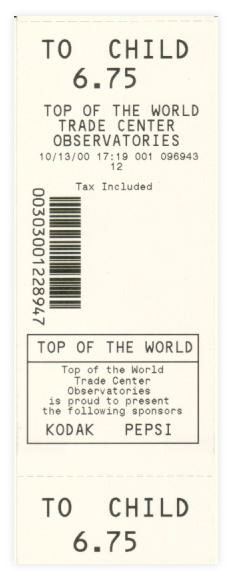 Child's ticket to the ''Top of the World Trade Center Observatories''. Dated 13 October 2000, this unused ticket was printed inside the World Trade Center prior to the tragic events of 9/11. Price of $6.75, barcode, and sponsor information is listed. Near fine condition.