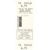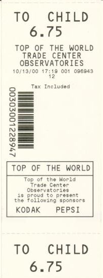 Full 2'' x 5.5'' children's ticket to the ''Top of the World Trade Center Observatories.'' Dated 13 October 2000, ticket was printed inside the World Trade Center prior to the tragedy. Price of $6.75, barcode, and sponsor information is listed. Fine condition.