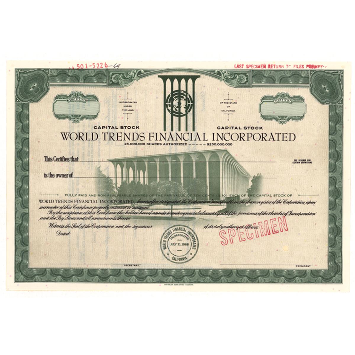 [SPECIMEN] ----, California. Stock certificate specimen in World Trends Financial Incorporated. Green / Black. Background vignette of company headquarters. Company log at top center. Specimen stamp and punch cancellation at lower right. “Last Specimen Return to Files Promptly” stamp at upper right. Very Fine.