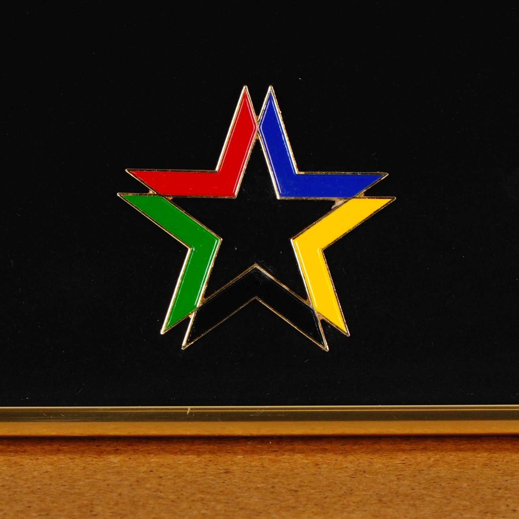 A collection of enamel pins from the World University Games, held in Buffalo, New York in 1993. This limited edition commemorative set, designed by Custom Pin & Design of Lake Placid, New York, features a dazzling array of designs that celebrate the international spirit of the games. Among the pins are colorful stars, welcoming motifs, national flags, hot air balloons, and the official mascot rendered in bright enamel. The set is attractively arranged in a black velvet-lined frame with a brass edge and includes the original brass identification plate identifying it as a limited edition issue. The World University Games, also known as the Universiade, is a major international multi-sport event organized for university athletes by the International University Sports Federation (FISU). This framed pin set captures the energy and pride of the 1993 Buffalo Games and serves as a remarkable keepsake for collectors of Olympic and international sports memorabilia.