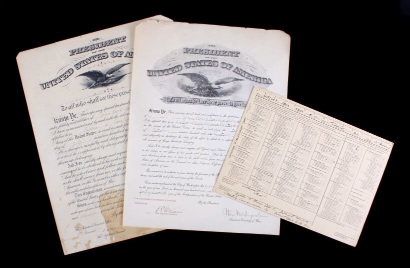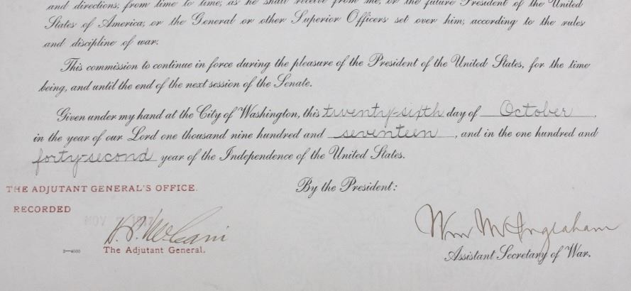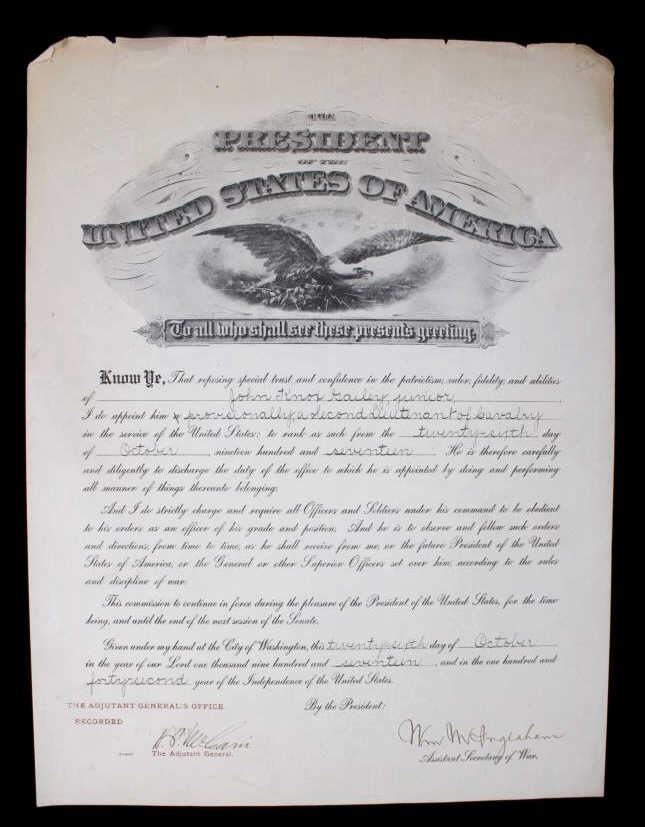Included for your consideration in this lot is a set of World War One era, and postwar promotional paperwork for John Knox Gailey. The lot includes three pieces of paperwork - two Officer Promotion Certificates - The first is for promotion to Second Lieutenant on November the 7th, 1917, the second is for promotion to Captain of Cavalry on September the 22nd, of 1921. Both documents are signed by The Adjutant General, and the Assistant Secretary of War. The third document is an "Officers Qualification Card", and is filled personal information of John Know Gailey. This qualification card dates to 1918. The collection of early ephemera is in fair-good condition overall - one of the promotion certificates shows heavy staining. The promotional certificates measures 14 3/4" x 11 1/2".