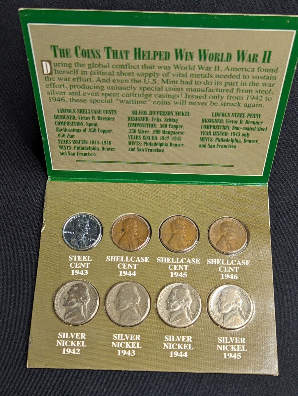 A World War 2 Set of Silver Nickels, copper and Steel Pennies. Makes a great gift for any collector.