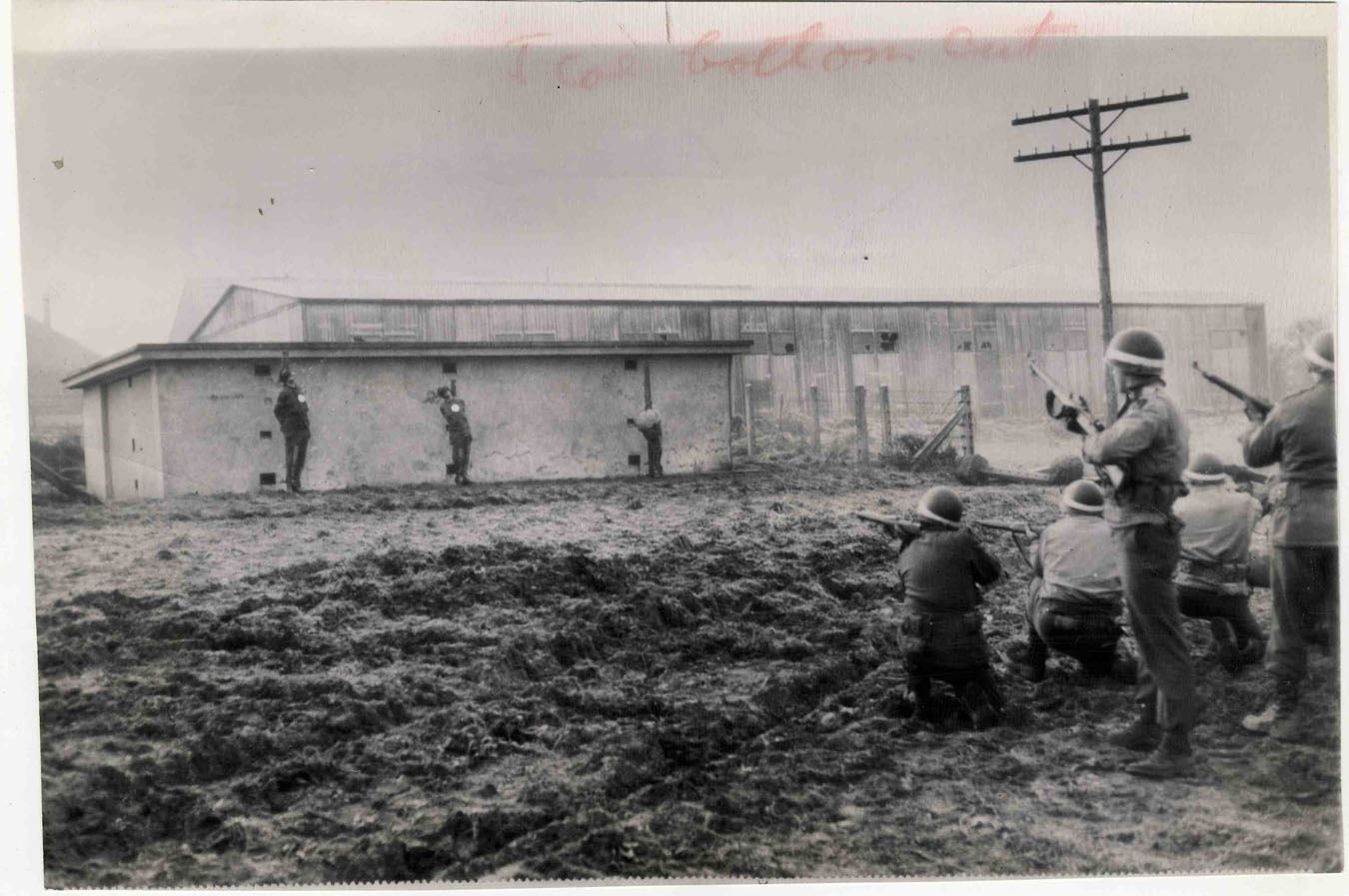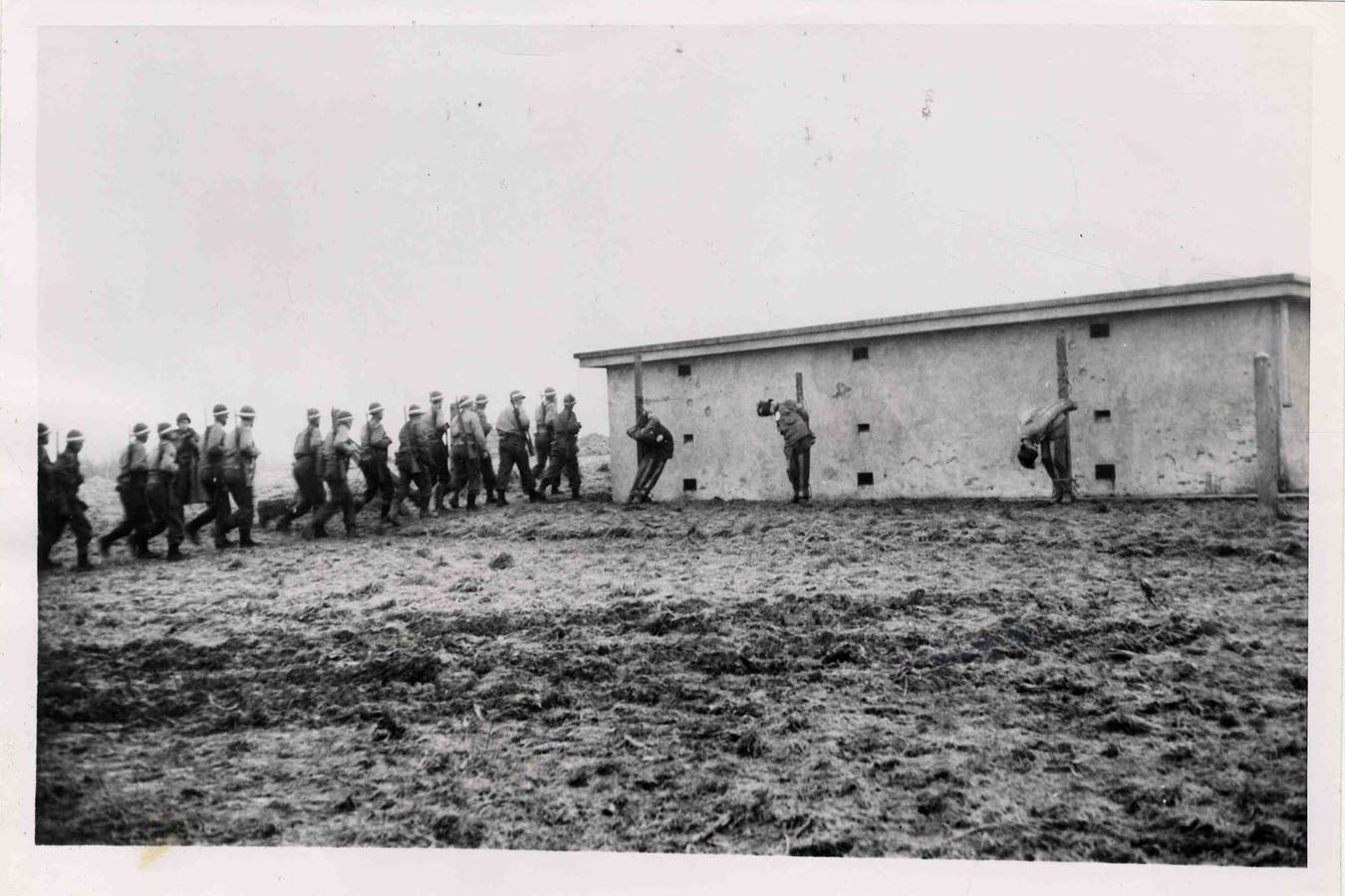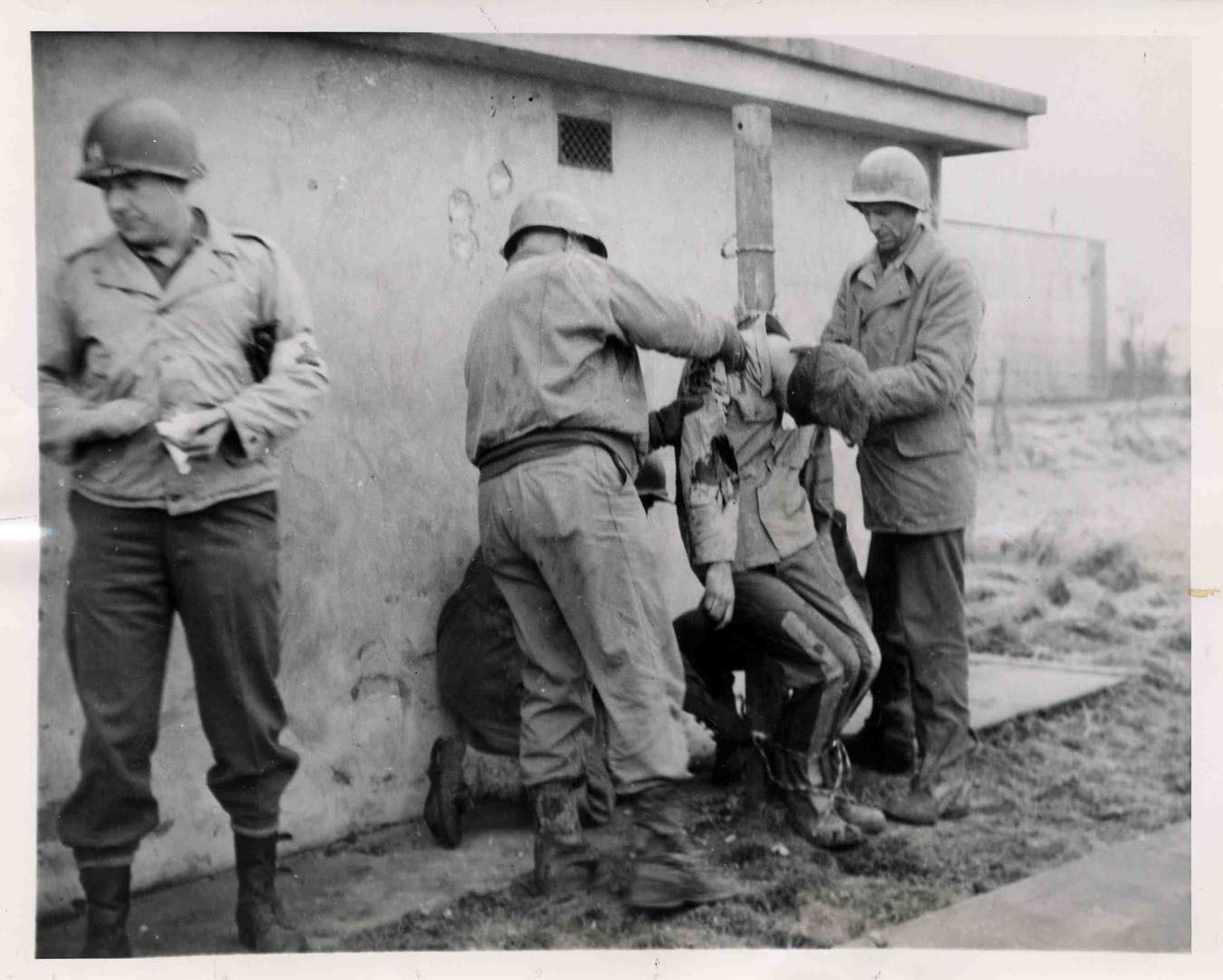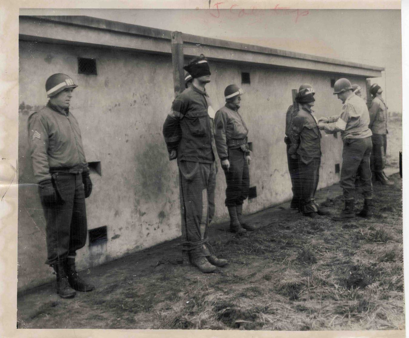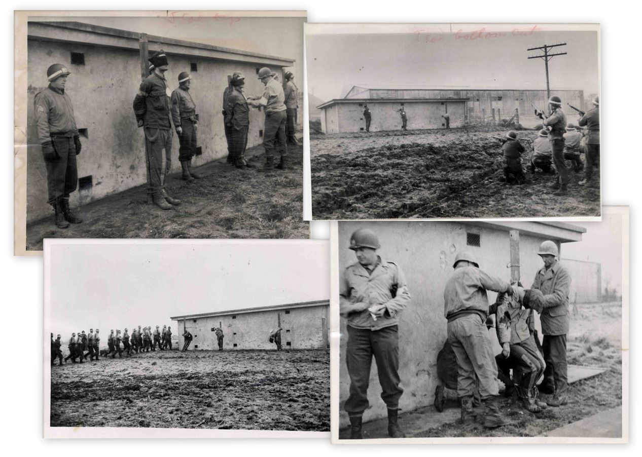 Series of World War II press photographs from May 1945 depicting the execution of German spies by firing squad. Captions read, ''German spies face execution by a firing squad after they were court martialed. At time of capture they carried with them a radio transmitter and receiver to relay...results of their reconnaissance of roads & bridges...they had perfected their disguise by mingling with American prisoners of war...'' Four photos range from 6.25'' x 9'' to 8'' x 9.5''. Very good.