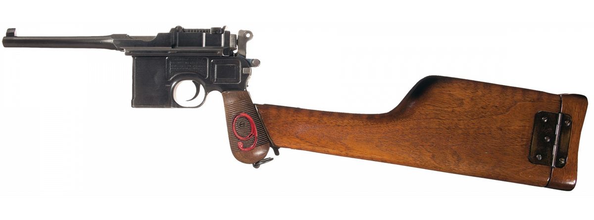 This is a standard WWI 1896 Mauser Contract Broomhandle pistol chambered in the 9 mm Luger cartridge. The frame and chamber area are both marked with the standard Mauser factory addresses with the left side of the chamber and top rear section of the breech bolt also stamped with a "Crown/U" proofmark. It has a standard fixed front sight with the tangent rear sight marked "50-500" with the "NS" marked hammer. It is fitted with standard 23 groove grips which have the large, red painted number "9" on each side. This pistol is complete with the original walnut shoulder stock/holster that has a matching attaching iron, numbered "297" on top.