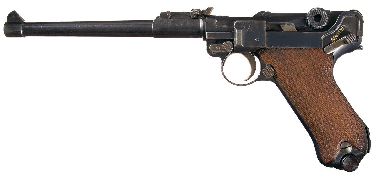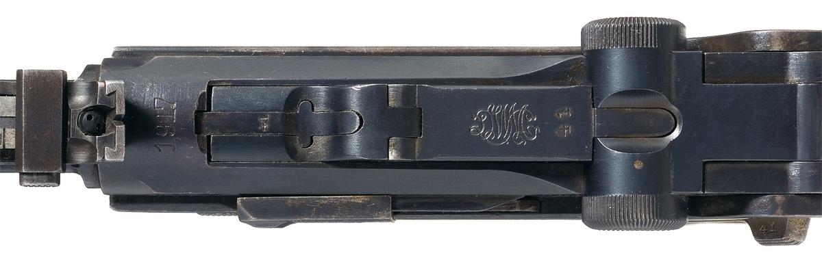 The top of the barrel extension is dated 1917 and the toggle has the "DWM" makers mark. Proper style sights, with fine adjustment screws and matching numbers on the tangent rear sight. Three "crown/ Gothic Letter" proofs are present on the right side of the extension with the Imperial firing proof, which is repeated on the barrel and breechblock, with matching partial numbers on the small parts. Properly marked "GESICHERT" and "GELADEN" on the upper safety area and extractor. Checkered walnut grips and blue magazine with wood base. Complete with a correct leather holster with maker's mark "JULIUS ARNADE / MOYS / 1915" on the inside of the flap.