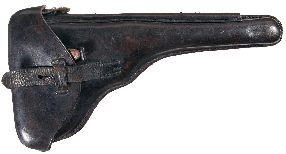 Condition: Very fine. The pistol retains 85% faded original blue finish with some wear and thinning on the barrel and side plate, high edge wear and some minor spotting on the barrel and grip straps. 50% of the original straw colors remain on the small components. The grips are also very fine with a few minor dings and bruises and crisp checkering. The markings are clear. Mechanically excellent. The holster is goodshowing some minor usage wear and tight stitching.