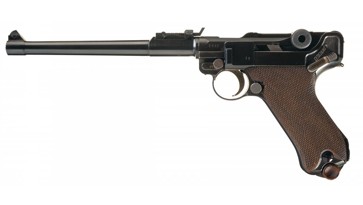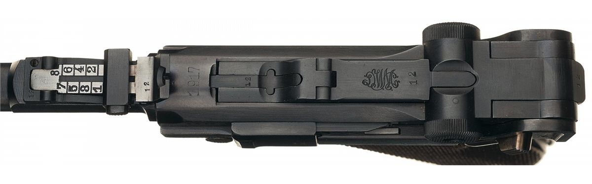 Blade front and tangent rear sights, "1917" date on the chamber and "DWM" monogram on the toggle link. Three "crown/letter" proofs are present on the right side of the barrel extension, with "Imperial Eagle" firing proofs on the extension, barrel and breechblock. Excluding the magazine, externally visible numbers match with proper "GESICHERT" and "GELADEN" markings on the upper safety position and extractor respectively. The front strap is stamped "99.R.6.10.". Checkered walnut grips. Included with the pistol is a board stock numbered "8083" and "99.R.6.10." on the mounting iron, and a brown leather holster with cleaning rod.