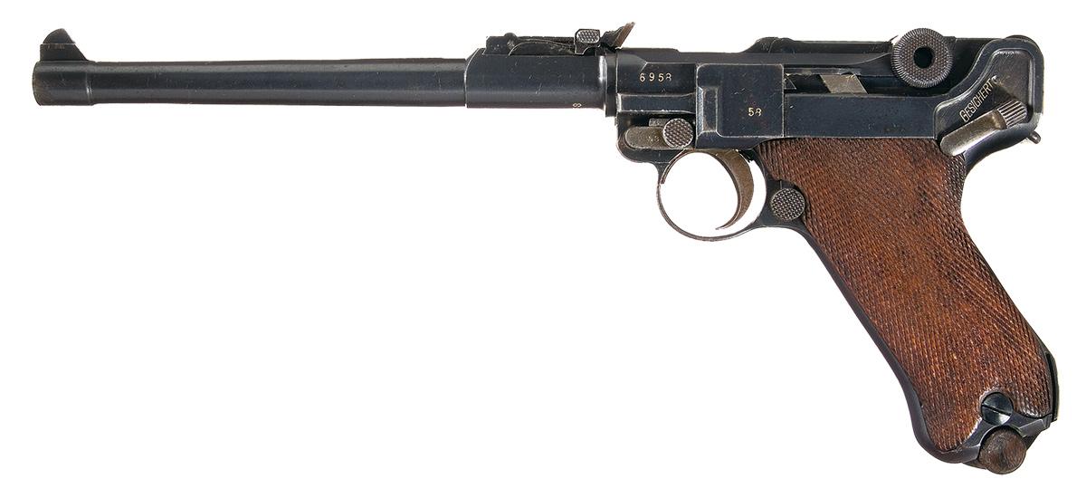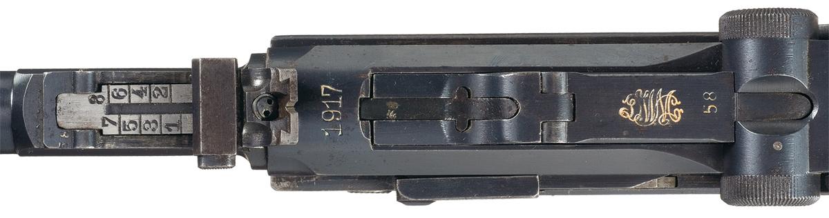 Dated 1917 on the chamber, with the "DWM" monogram on the toggle. Fitted with blade front and tangent rear sights, the latter numbered to match the gun and fitted with a fine adjustment screw. The right side of the chamber has a set of three "crown/ gothic letter" proofs and the Imperial Eagle firing proof, which is repeated on the barrel and breechblock. Matching numbers on the latch, side plate, trigger, hold open, safety, toggle links, breechblock and firing pin. Proper "GESICHERT" and "GELADEN" marked upper safety position and extractor, nickel plated magazine with wood base and checkered grips.
