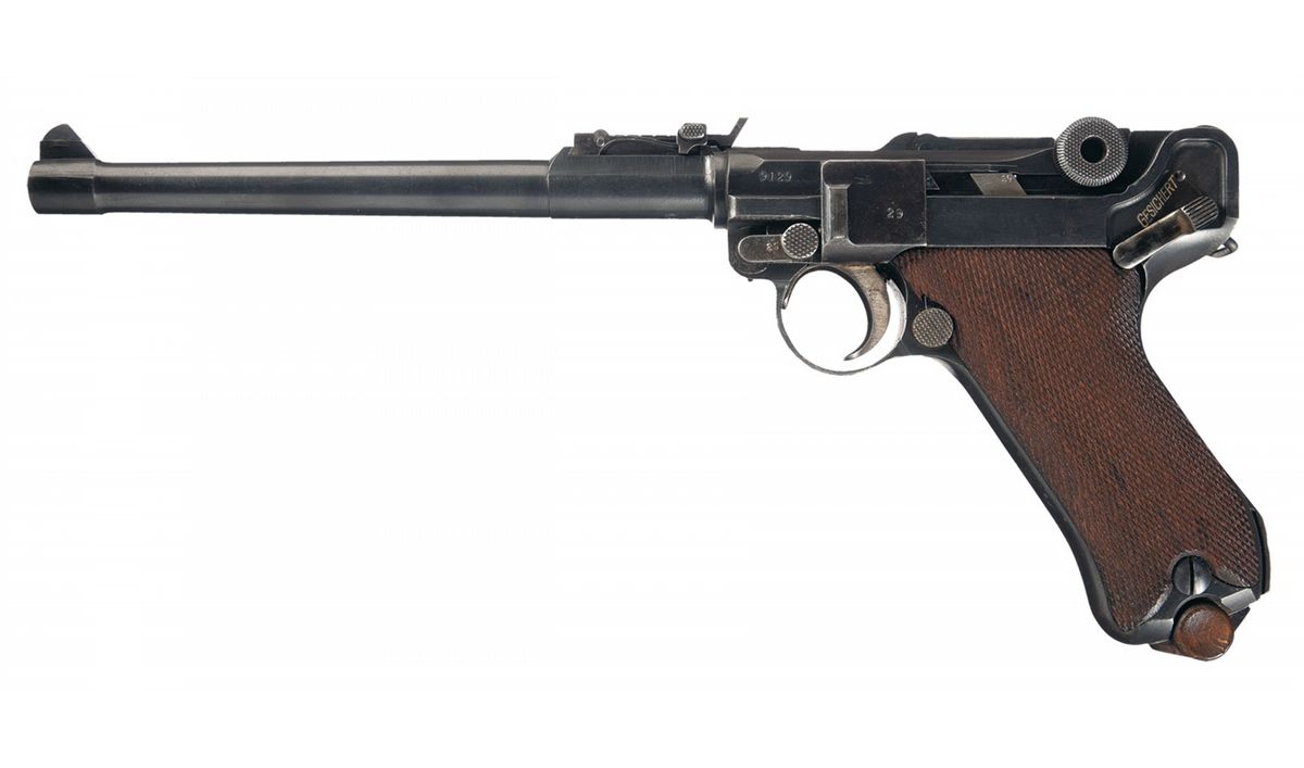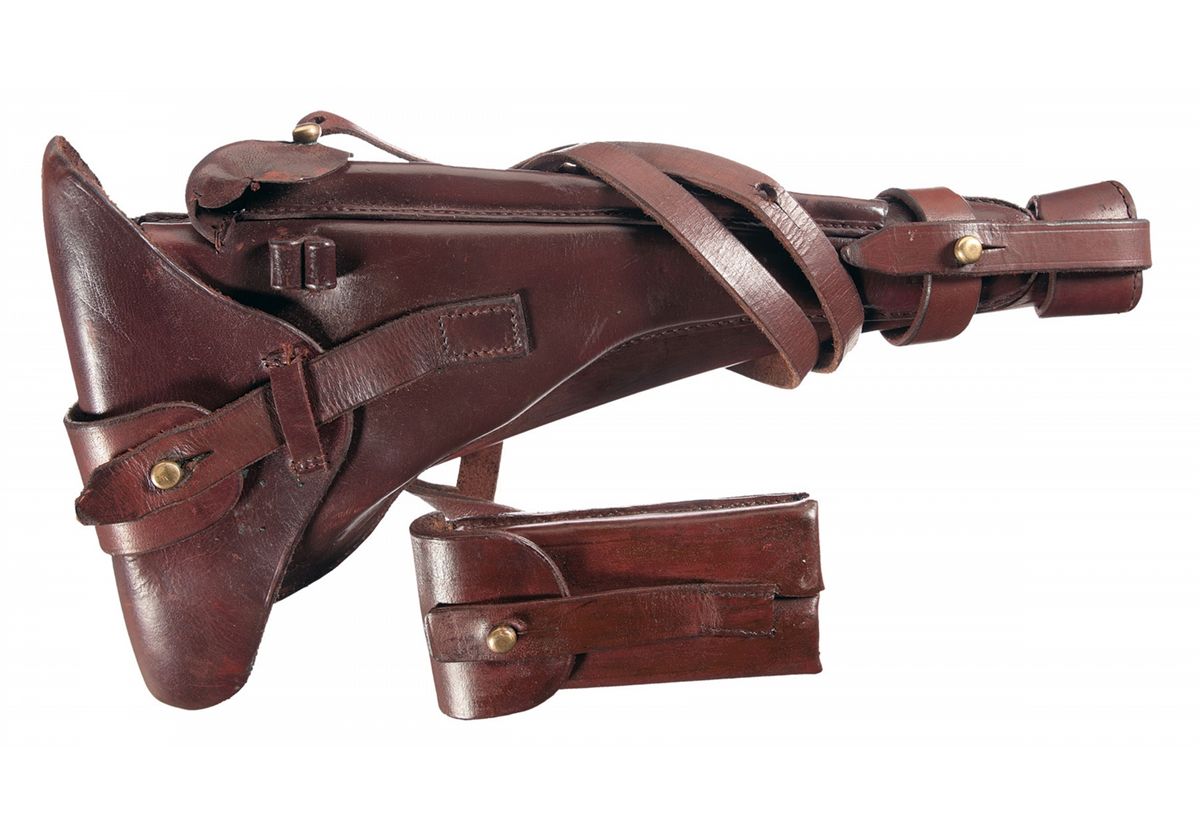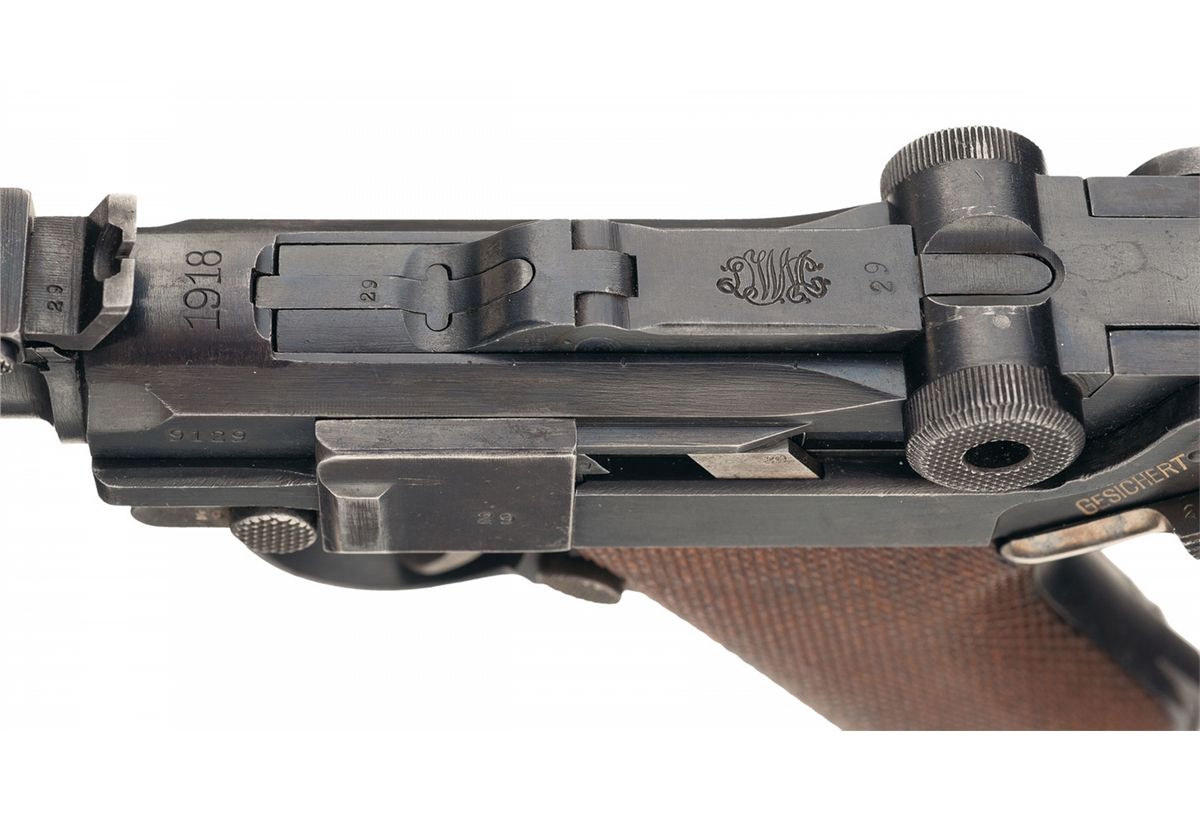 This is a 1918 date DWM WWI Artillery Luger that has a modern reproduction leather holster, shoulder straps and board stock. These Lugers have the distinctive 8-inch barrel with nine position, tangent rear sight graduated from 1-8 (100-800) meters. The chamber is dated 1918 and the toggle is marked "DWM". Both the barrel and barrel extension have the standard WWI Imperial acceptance and firing proofs. It has the properly marked "GESICHERT" and "GELADEN" safety and extractor markings. It is fitted with an original nickel plated WWI magazine with the matching wooden base marked "9129/a". This pistol is complete with an older style, correct reproduction artillery rig to include the holster, wooden board stock, shoulder straps, double magazine pouch and cleaning rod.