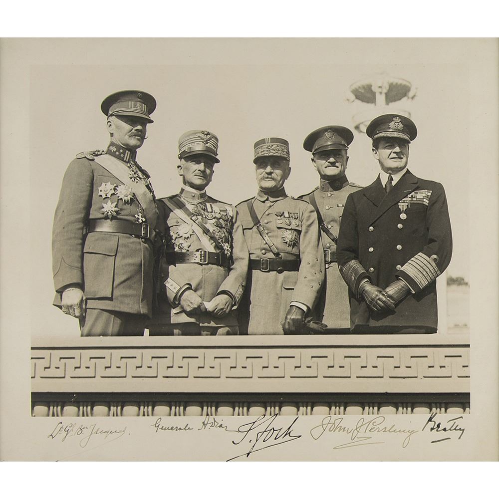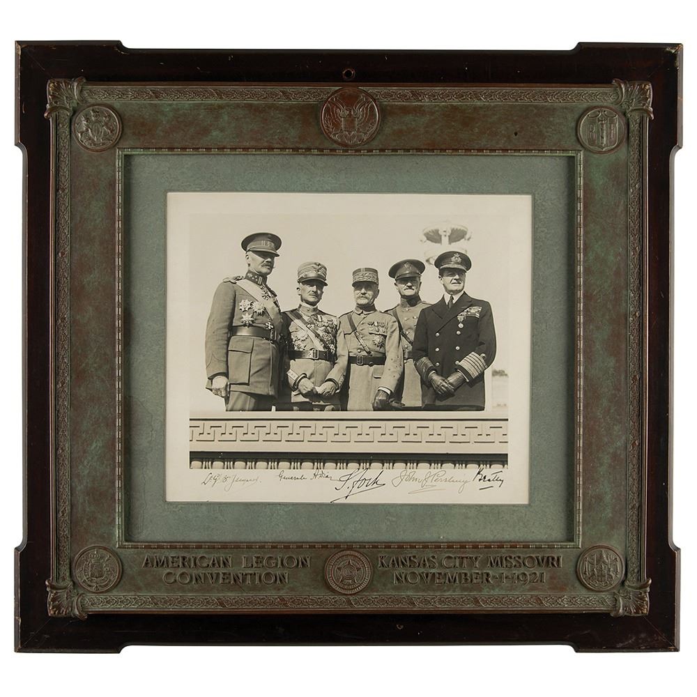 Historic vintage matte-finish 11.25 x 9.75 photo of five Allied military leaders of World War I—Gen. Baron Jacques of Belgium, Gen. Armando Diaz of Italy, Marshal Ferdinand Foch of France, Gen. John J. Pershing of the United States, and Sir Admiral Earl David Beatty of Great Britain—attending the Liberty Memorial dedication ceremony in Kansas City on November 1, 1921, signed in the lower border in fountain pen by all five. Displayed in its original heavy bronze-and-wood plaque, 21 x 19, with legend below: "American Legion Convention, Kansas City, Missouri, November 1, 1921." In fine condition, with minor dampstaining to the mat. A magnificent piece signed by the five victors of 'the war to end all wars.'