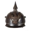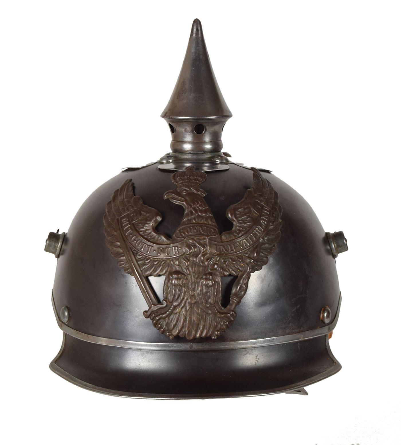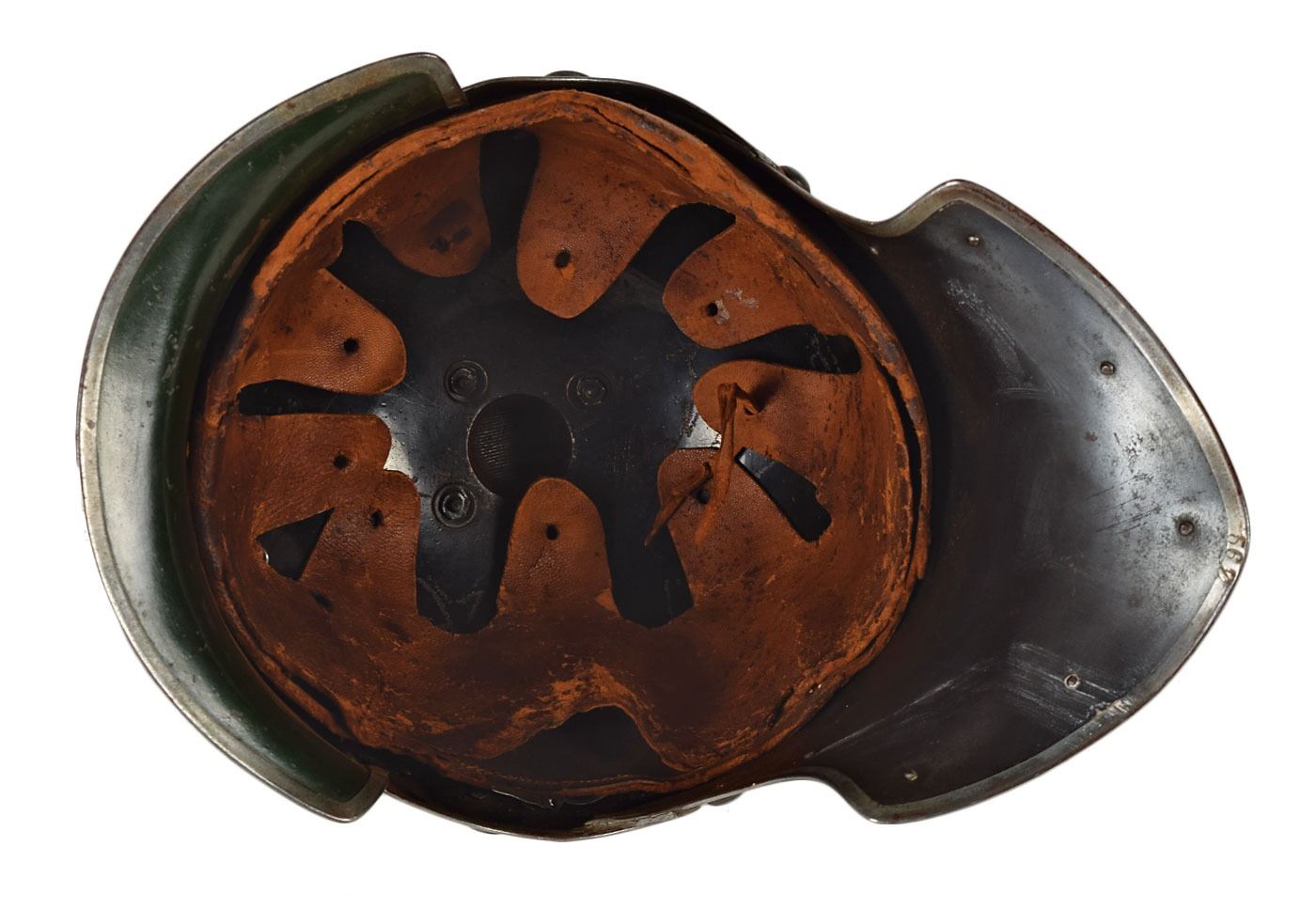Imperial German (Prussian) Model 1905 helmet for a Jager zu Pferde [Mounted Dispatch Rider], as issued to enlisted men in Regiments 1 through 7. The inside of the helmet’s dome is stamped “Br. Jsraei, 1918,” and the underside of the visor is painted dark green. The helmet plate is die-stamped metal with the Prussian eagle insignia with German motto reading: “Mit Gott Fur Koenig Und Vaterland.” The inner leather headband is mostly intact, but has several tears and separations. The helmet is missing the roundels and chin-scales, but is otherwise in fine condition.