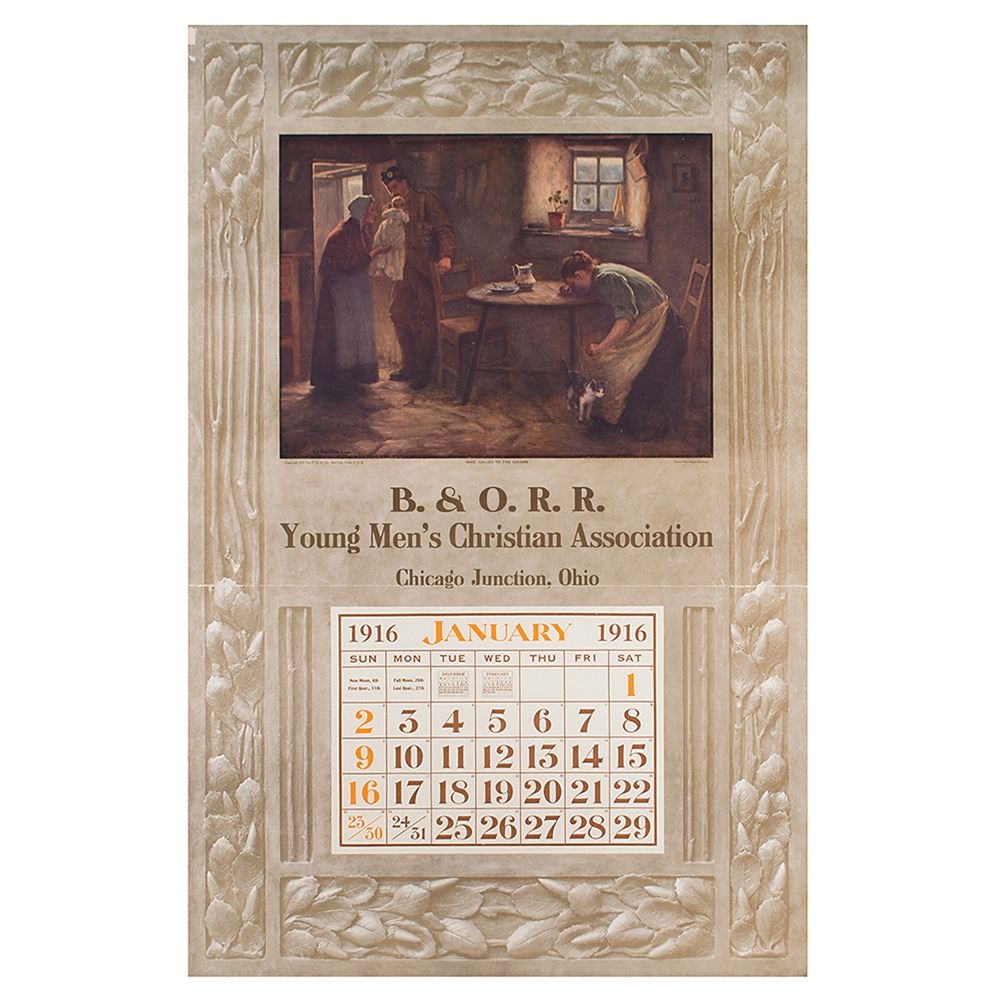 Oversized color 20.25 x 30.75 calendar for January 1916 issued by the Baltimore and Ohio Railroad Young Men’s Christian Association of Chicago Junction, Ohio, entitled 'Called to the Colors,' featuring an image of a painting by Henry John Dobson of a soldier saying goodbye to his family as he departs for war. Printed by the Thos. D. Murphy Co., Red Oak, Iowa. In fine condition, with folds as issued and wear to edges.