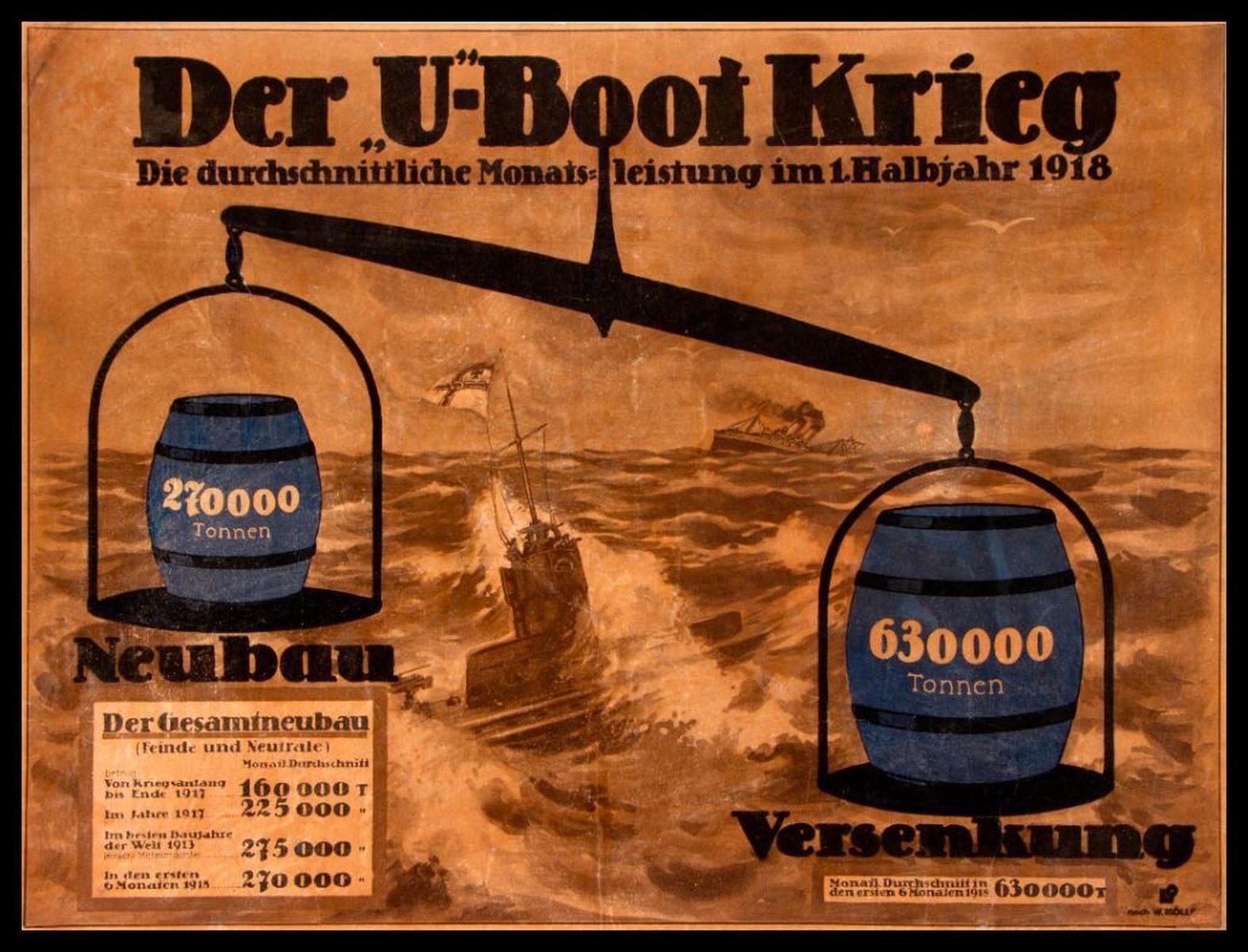 Vintage World War I Poster. Der U-Boot Krieg, 1918. Paper size: 28 1/2 x 21 1/2 inches. Linen backed. Condition: as per photograph.
