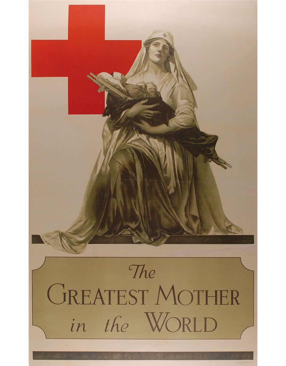 Somber original color 28 x 45 World War I poster printed circa 1914, displaying artwork by Alonzo Foringer reminiscent of the ‘Pieta’ that shows a pensive nurse cradling a wounded soldier as a mother would her child. The the symbol of the Red Cross is prominently featured in the background, and the text in a box at the bottom reads, “The Greatest Mother in the World.” Printed in the bottom border is “Form N.Y. 32. Second War Fund.” Poster has been professionally linen-backed to a slightly larger size. In very good condition, with two repaired tears to the right side (one being relatively small and the other passing from the edge to the center in the blank area between the image and text).